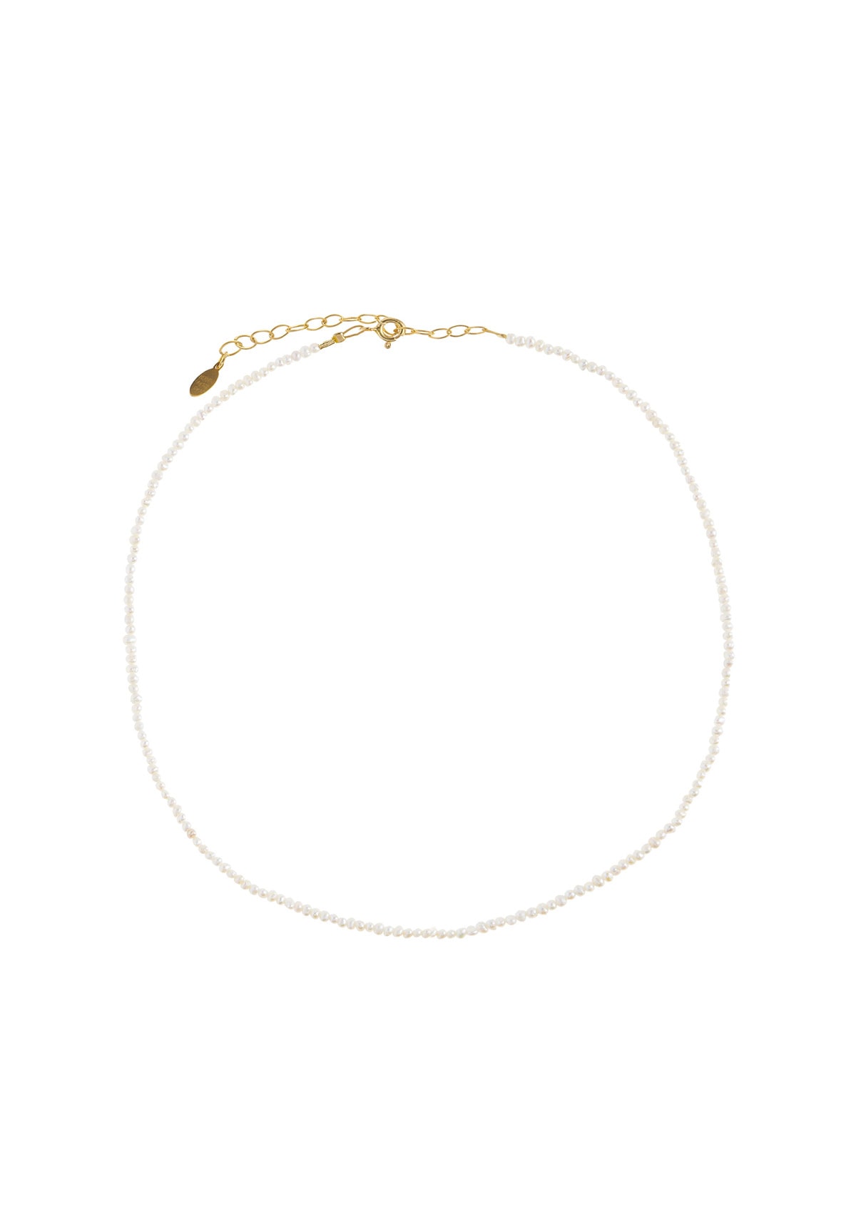 A vintage-like, pearl necklace with a 5 cm extension allowing a versatile length, for a classic, minimalistic look. -