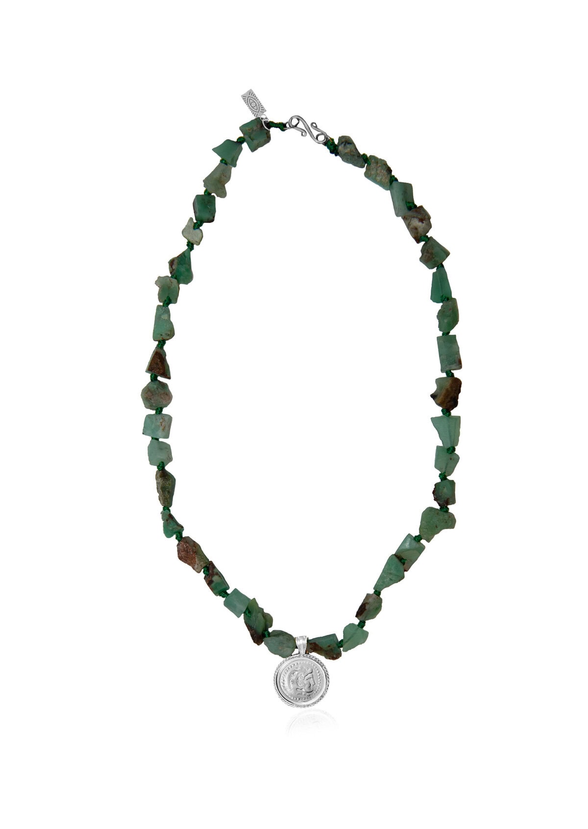 An irregular semi-precious stone necklace in a deep, forest-green hue, adorned with a coin depicting Hercules, the heroic semi-god of Greek mythology. Known for manifesting optimism, joy, and happiness, Chrysoprase is a powerful stone for uplifting one’s energy.