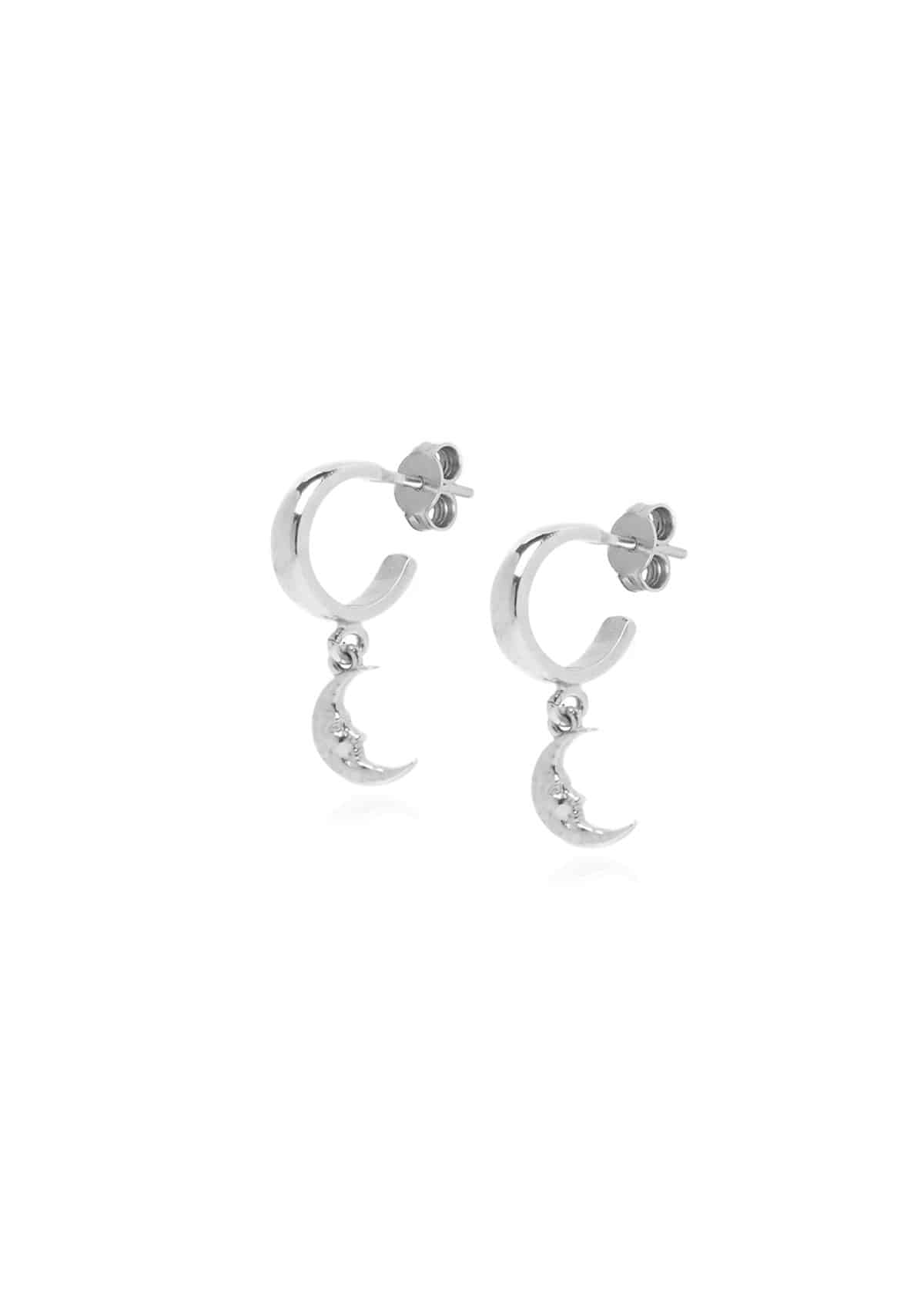 A pair of delicate moons hanging from two small hoop earrings that gracefully hug the ear. They also look amazing worn on the same ear if you have multiple piercings.