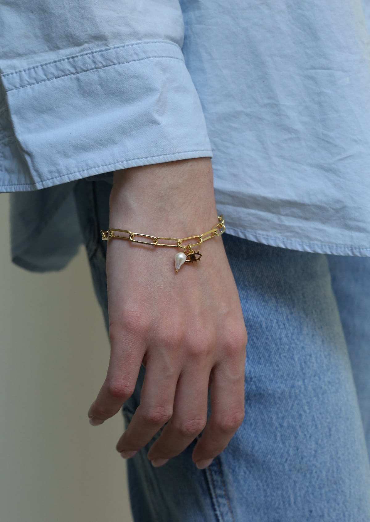 A dainty wide paperclip bracelet adorned with a tiny eye and a tiny pearl charm. Layer with other chain bracelets.