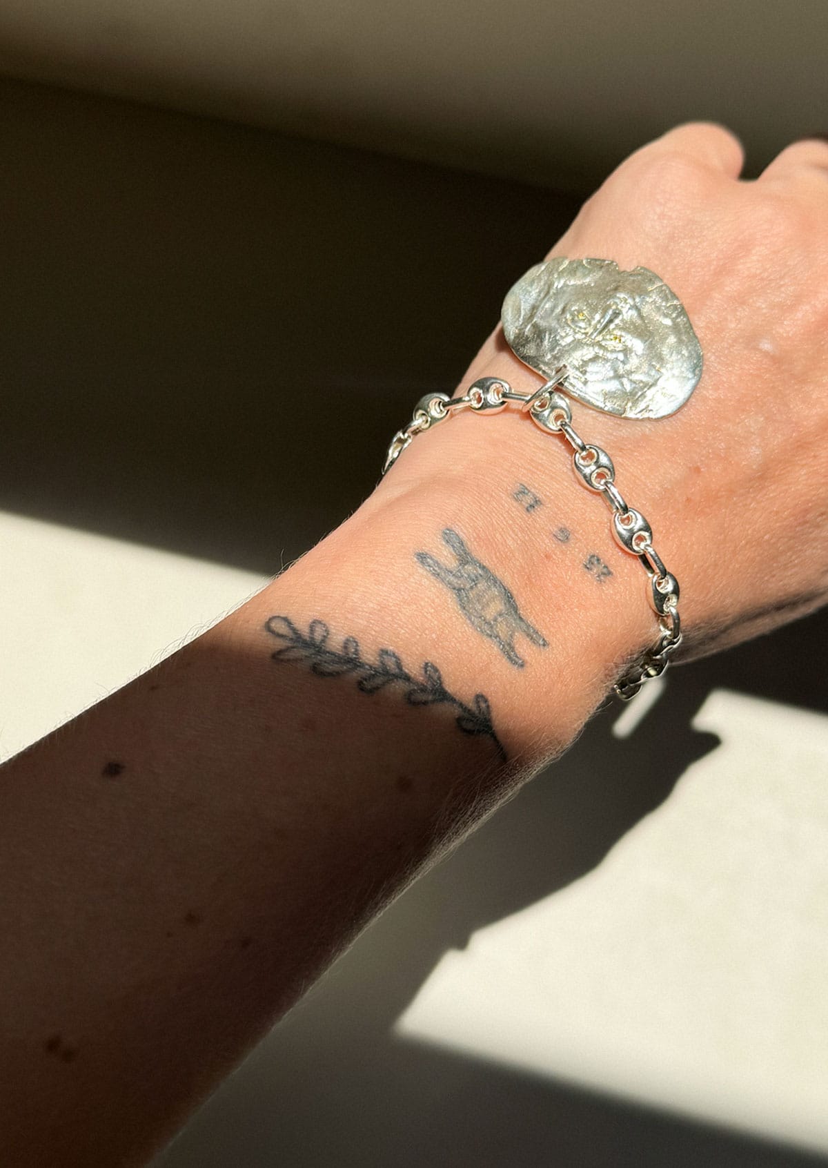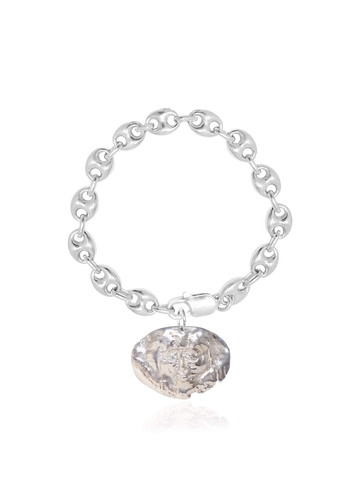 A charm inspired by ancient Greece hanging from a quirky-shaped chain, reminiscent of the Greek letter Θ (theta).