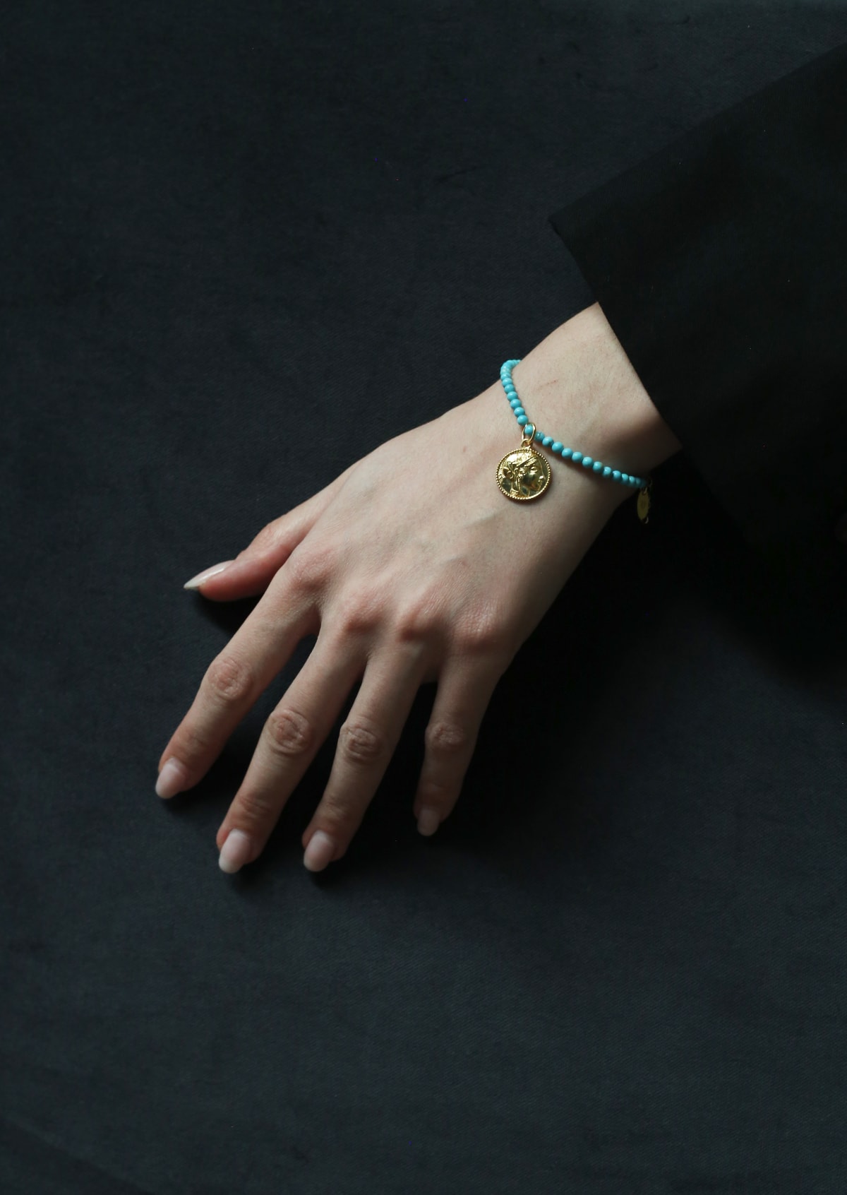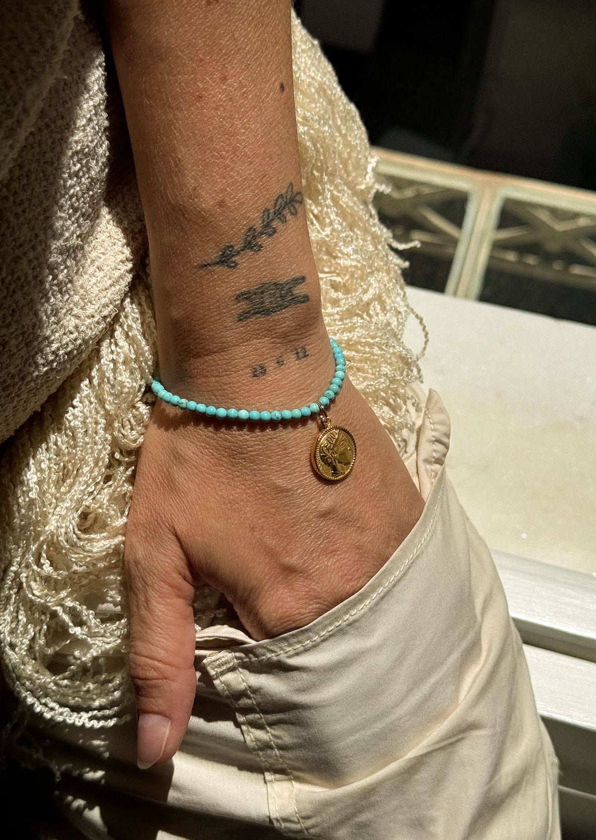 Joy- sparkling jewelry! A turquoise howlite bracelet adorned with a charm depicting the ancient Greek goddess Athena. Soothing and gentle, Howlite is one of the “attunement stones” which link the user to higher spiritual consciousness. It opens and prepares the mind to receive higher energies.