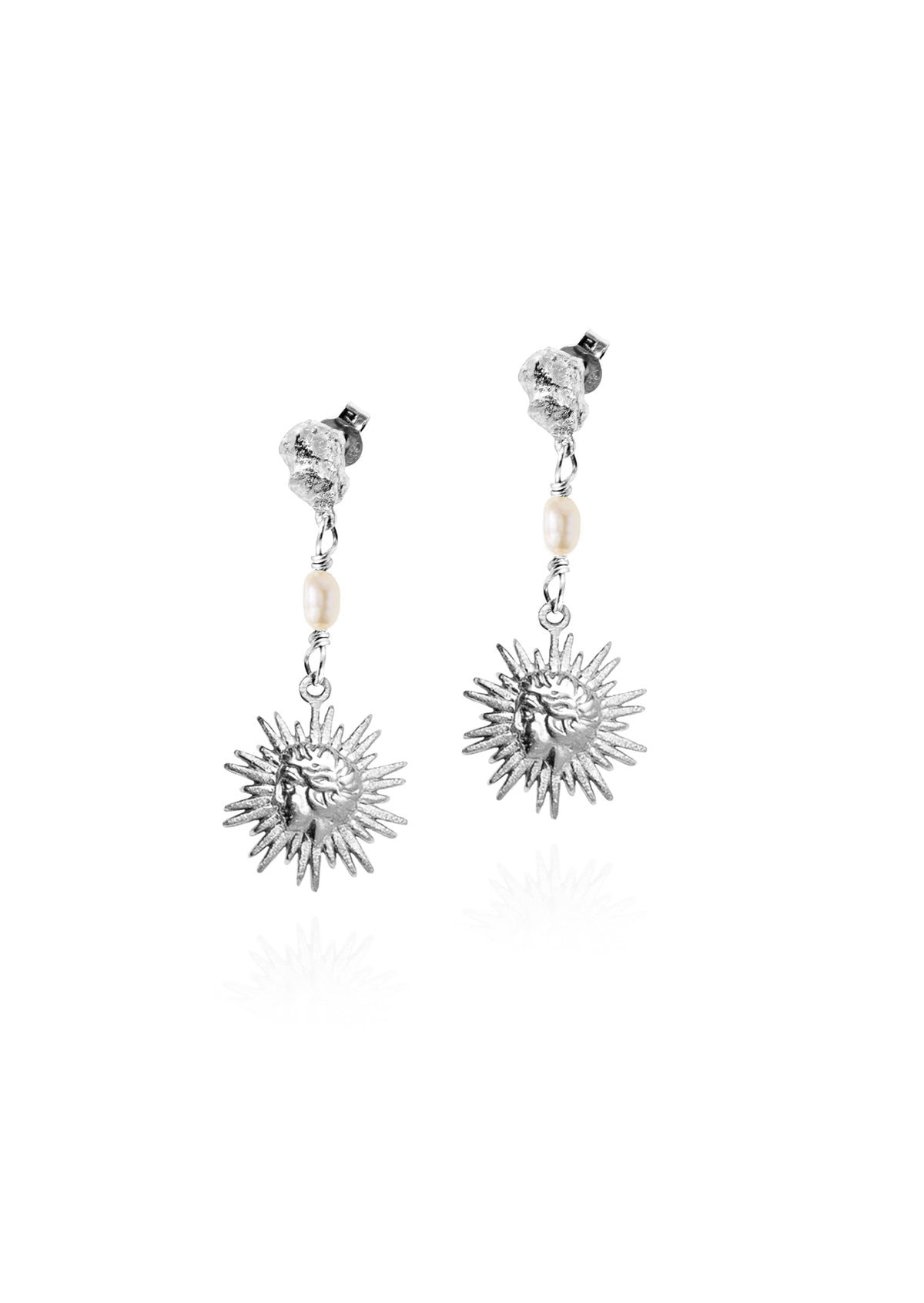 A pair of drop earrings comprised of an asymmetrical metal element, a pearl drop, and a tiny sun. From formal and classic, to indie and bohemian looks, this is a versatile piece that complements various styles.