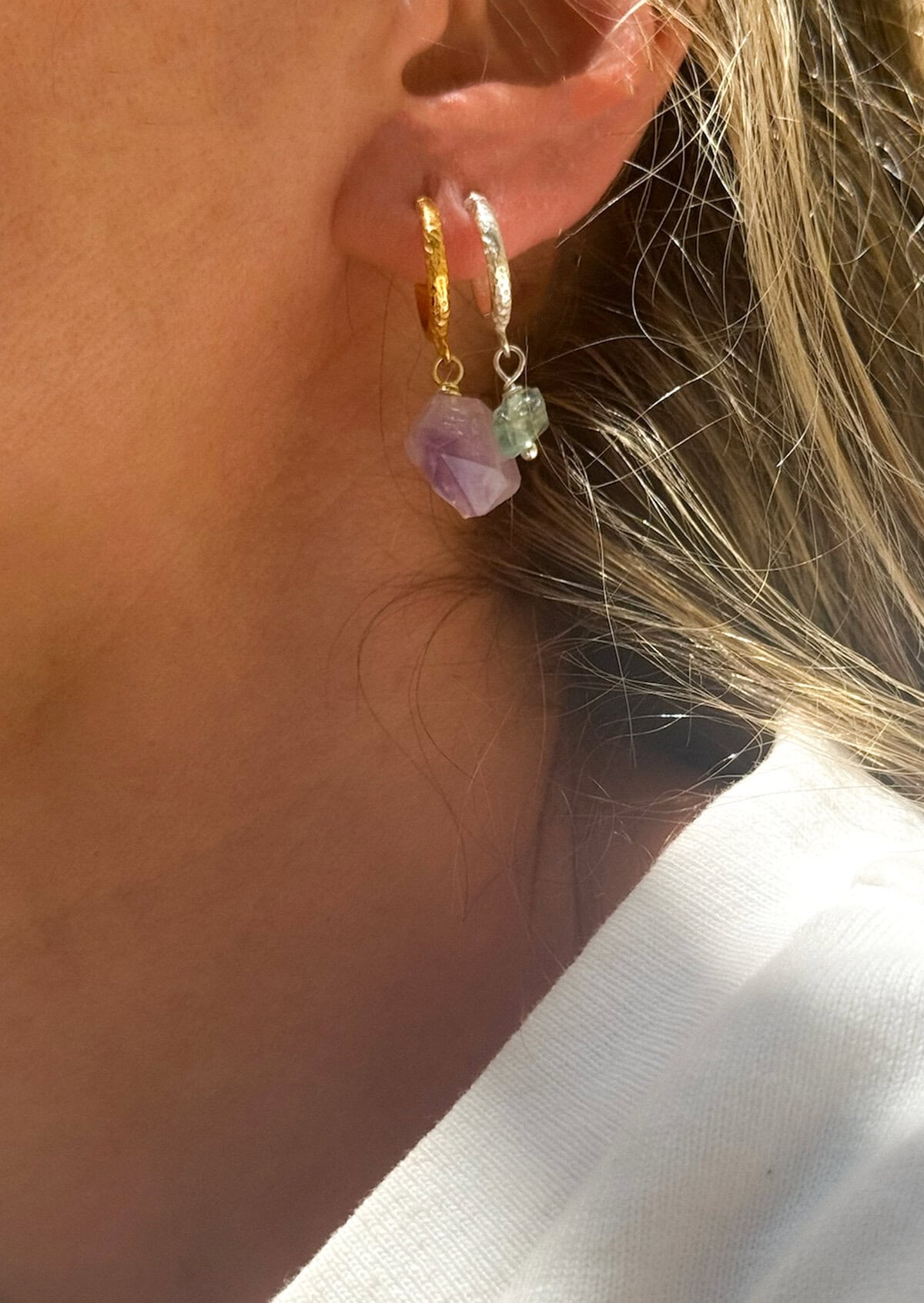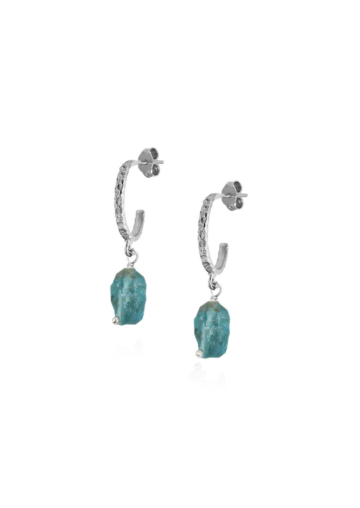 A pair of discreet hammered hoops adorned with an apatite stone. An elegant piece suitable for every style. Perfect as a pair, stacked up or mixed with other studs and hoops. Labradorite amplifies energetic protection and is known to foster intuition and enhance psychic abilities.