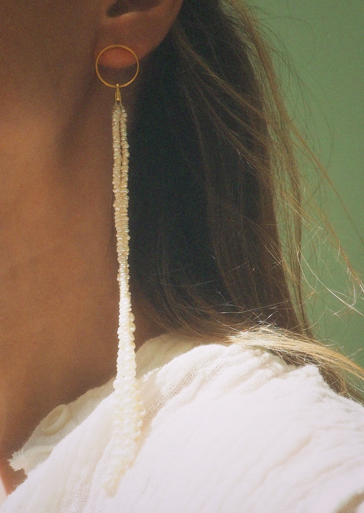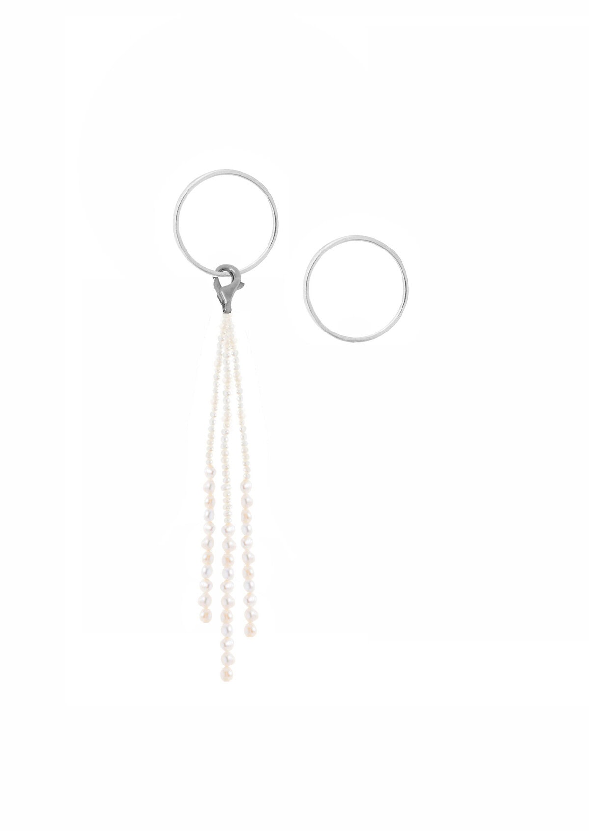 A pair of circle stud earrings, one of which is adorned with an extra-long trio of pearl strings, following the trend of mismatched earrings that has reigned the latest runway trends. Fun and avant-garde.