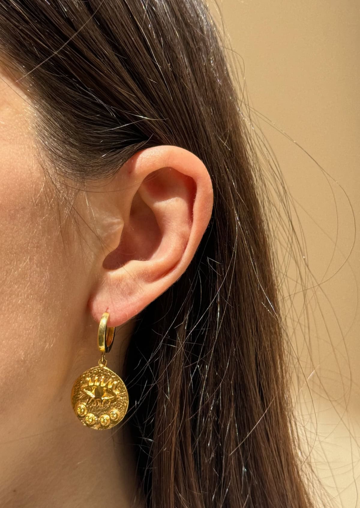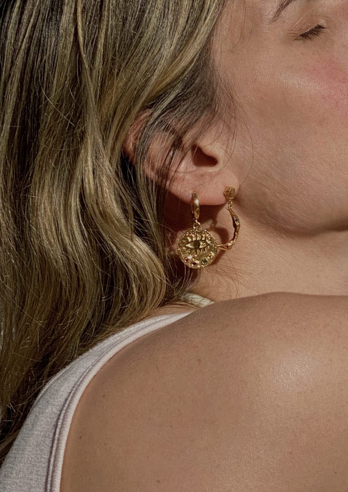 A pair of fine hoops with the small Kressida evil eye medallion and a selection of gemstones that will add instant spark to your look! Wear them as a pair for a classic style or play around and pair a single one with other earrings!‘’Valuable like gold’’ is the meaning of the Greek name Kressida. Since forever, humans have used various objects, charms and stones for protection, as they work as filters, absorbing negativity. More than a statement piece, the Kressida earrings are meant to serve as a talisman against all bad energy and specifically the evil eye. -