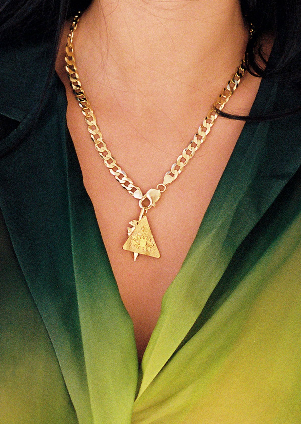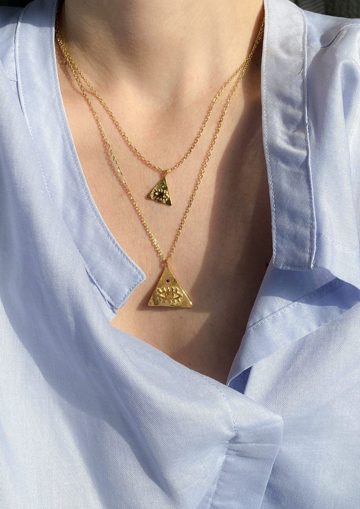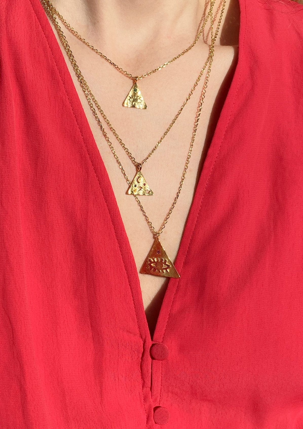 Embrace the power of the pyramid with our Kressida pyramid charm and embark on your own transformative quest for spiritual awakening! The pyramid has been a sacred symbol across various cultures since antiquity. Its triangular shape symbolizes the unity of mind, body, and spirit. A symbol of enlightenment, self-awareness, and spiritual growth, the pyramid’s four sides represent the four elements—earth, air, fire, water. The bottom of the pyramid represents a solid, earthy foundation, whereas the pointed top represents being able to reach into higher realms of consciousness, a balance between the material and spiritual aspects of life. It is believed that the shape of a pyramid can amplify and focus spiritual energy, possessing powerful energy-clearing properties.
