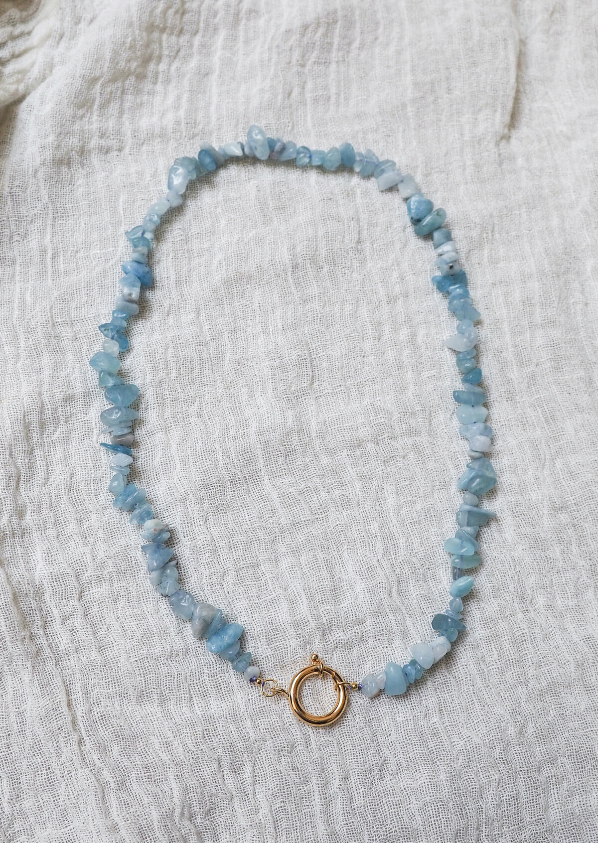 A clear aqua chunky stone necklace with a circular clasp that will accompany all your summer looks, from tanks and shirts to evening maxi dresses. Elegant and playful, this will become your new favorite statement piece.