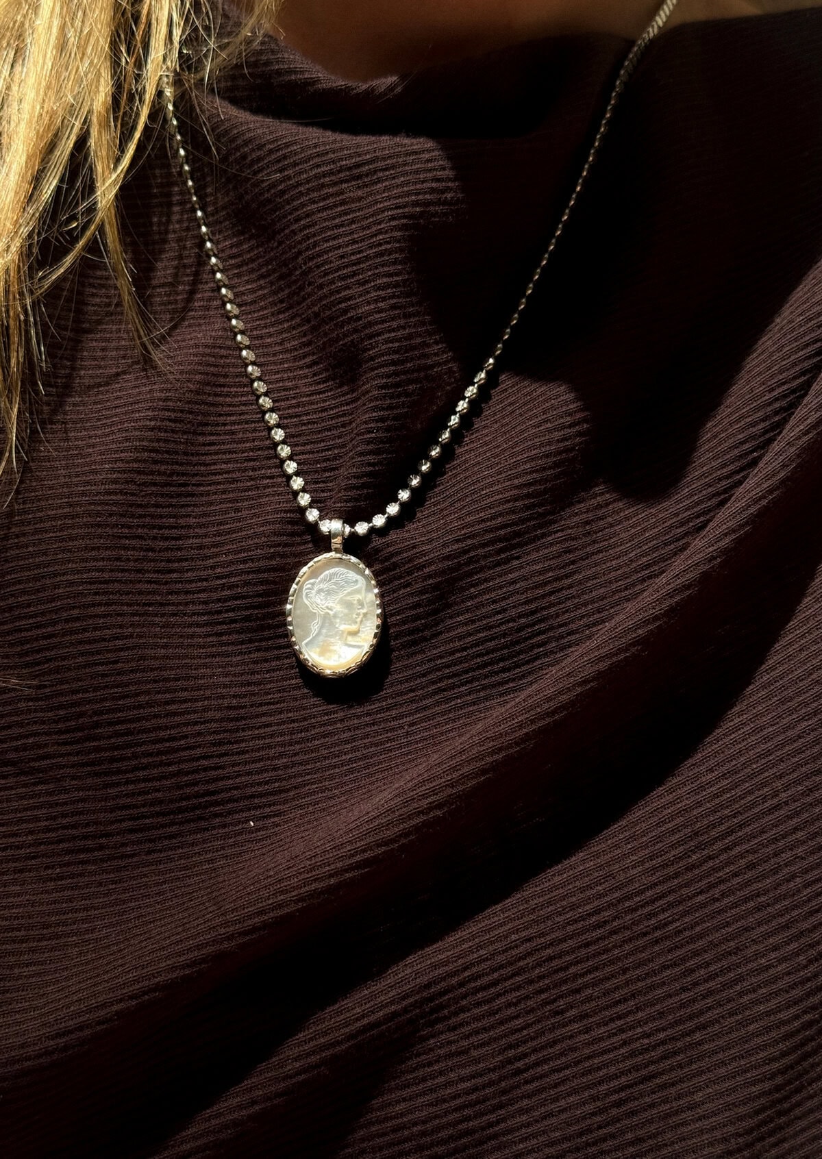 Ancient engravings meet modern day fashion in our new cameo charm pearl necklace featuring Hygeia, the mythological Greek goddess of health, carved on a mother of pearl stone.