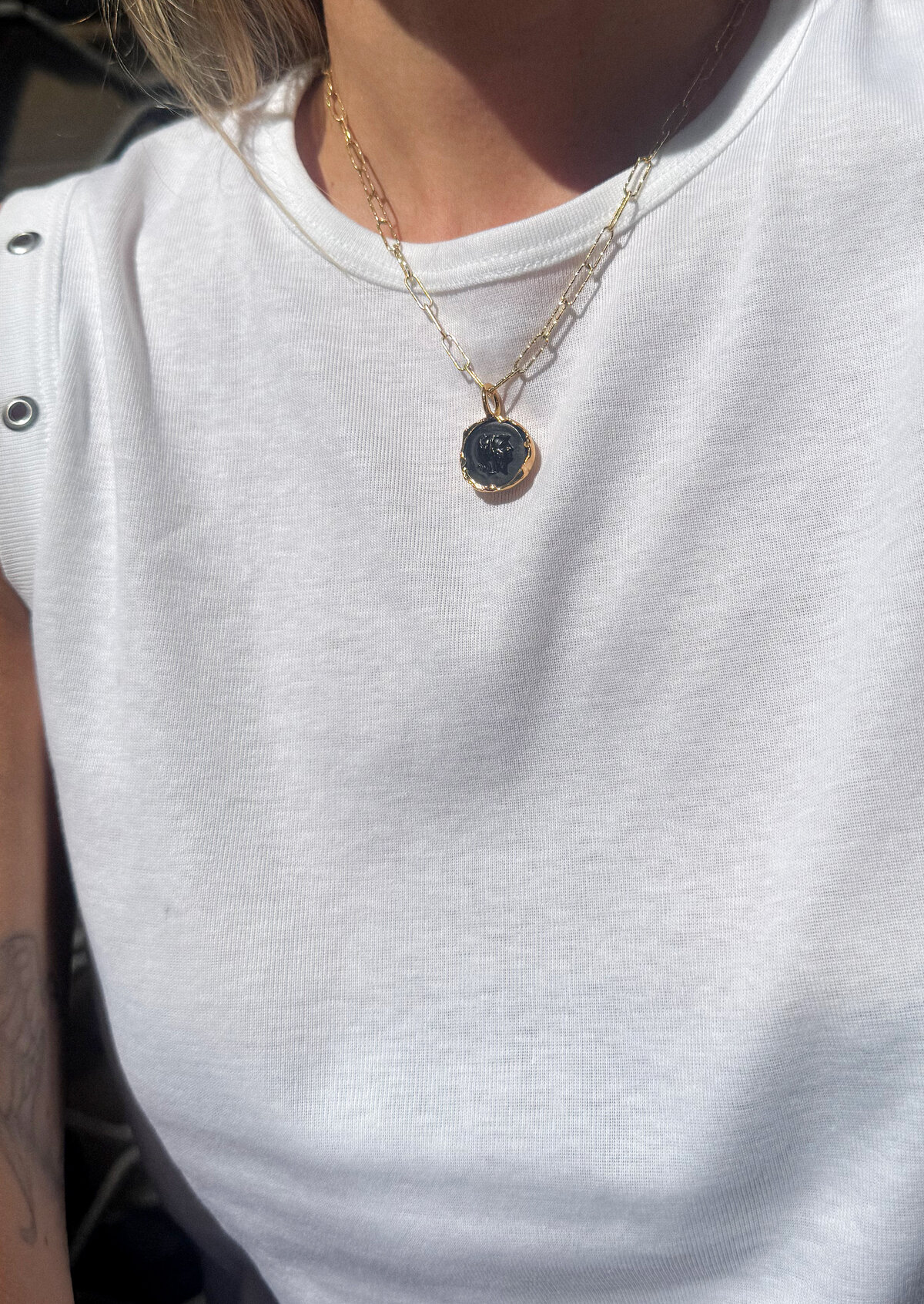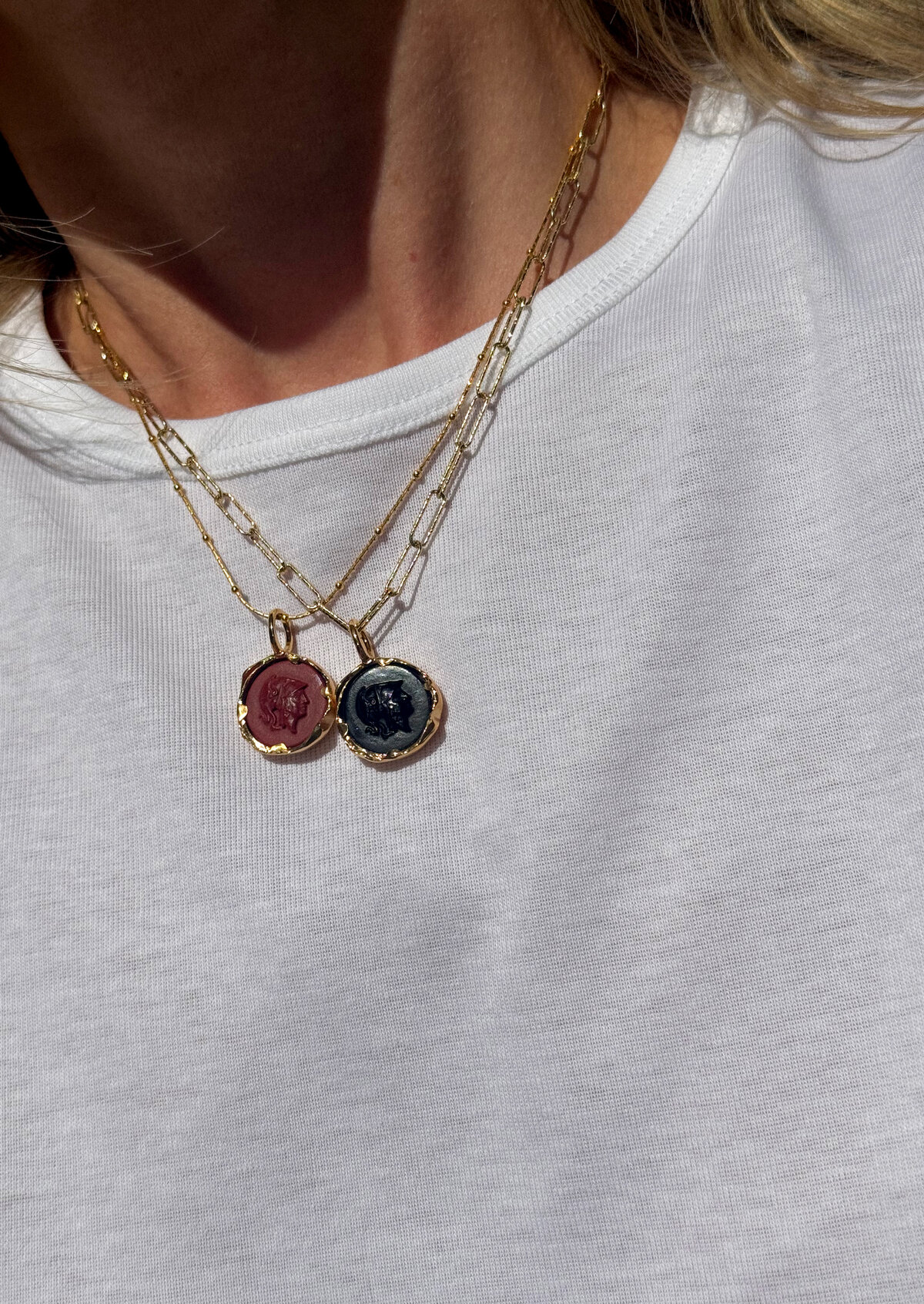A sculpted onyx charm featuring “Athéna”, the goddess associated with wisdom, handicraft, and warfare in Greek mythology and the protectress of Athens, carved on an onyx stone, hanging from the Hermina staple diamond cut paperclip chain. Crafted with a diamond-cut technique, is has a subtle yet noticeable shimmer. Perfect solo or stacked with longer chains.