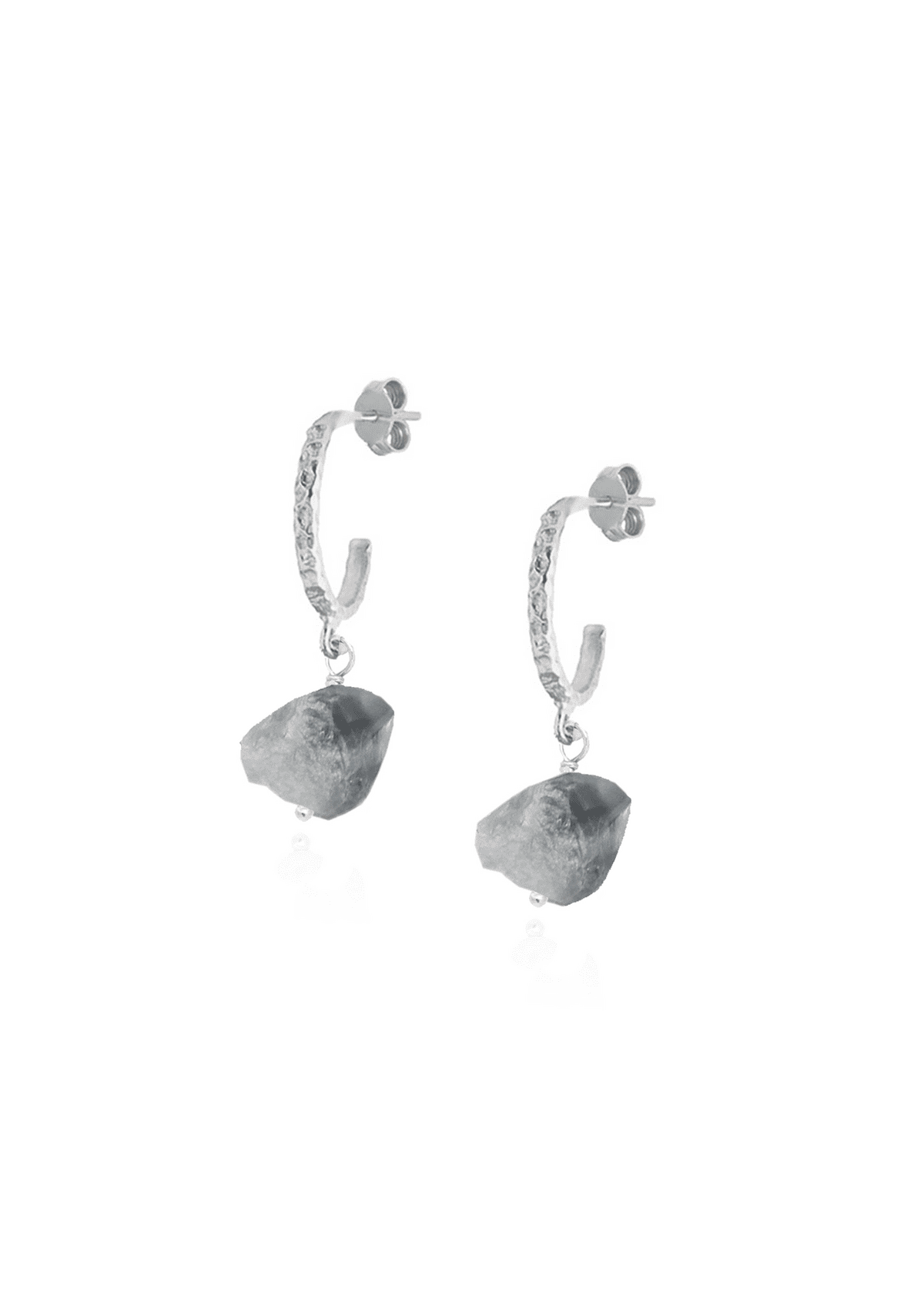 A pair of discreet hammered hoops adorned with a labradorite stone. An elegant piece suitable for every style. Perfect as a pair, stacked up or mixed with other studs and hoops.