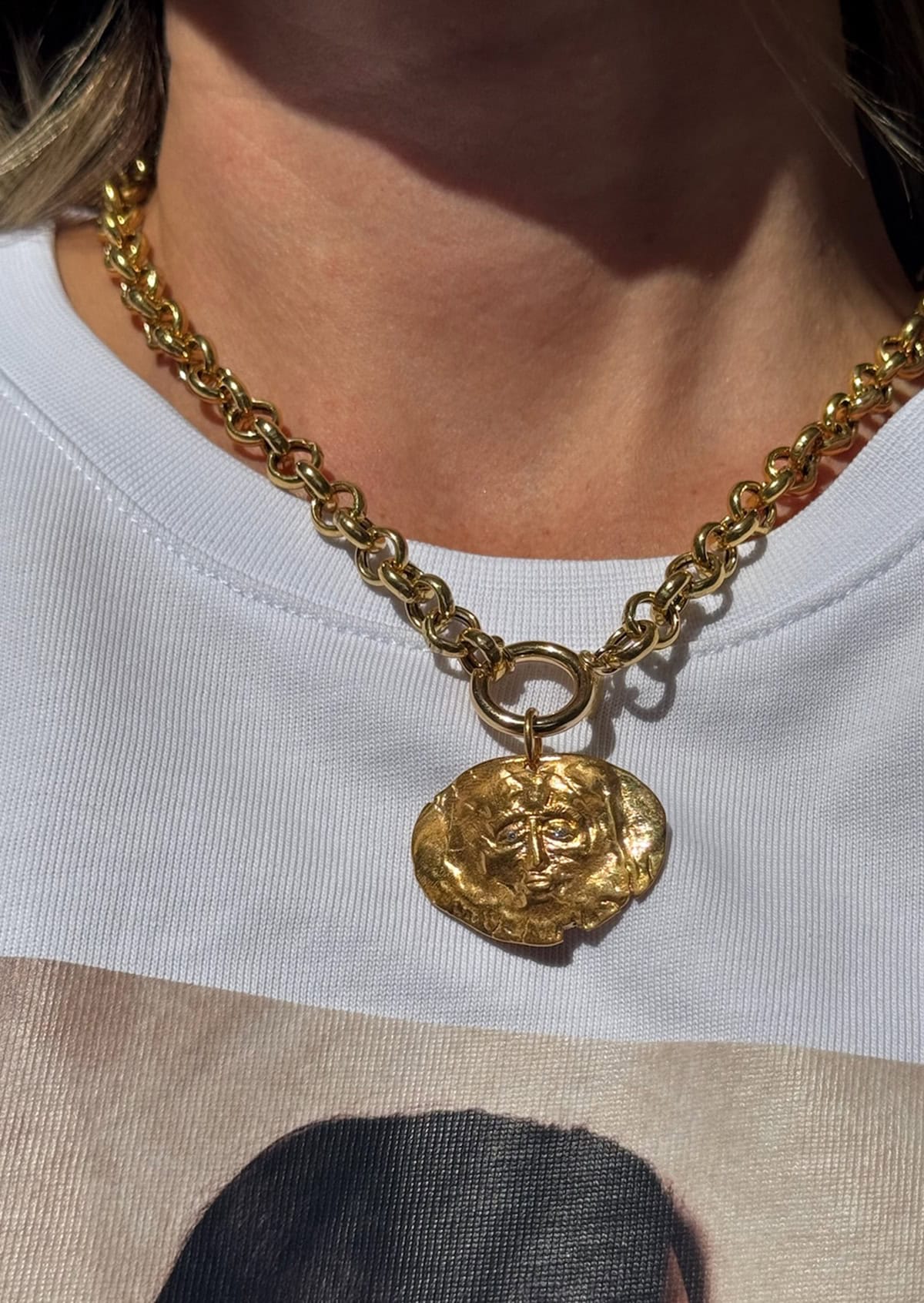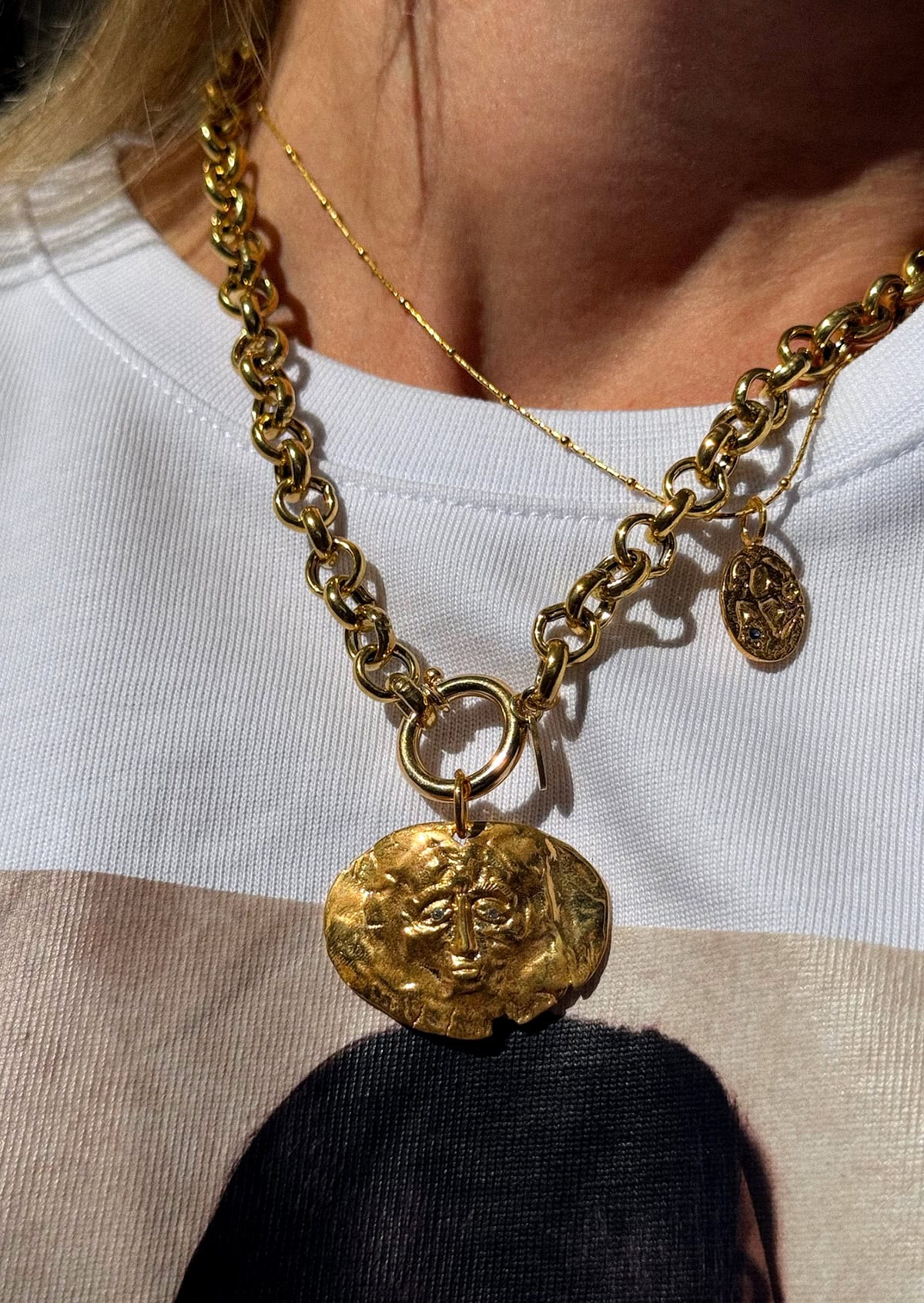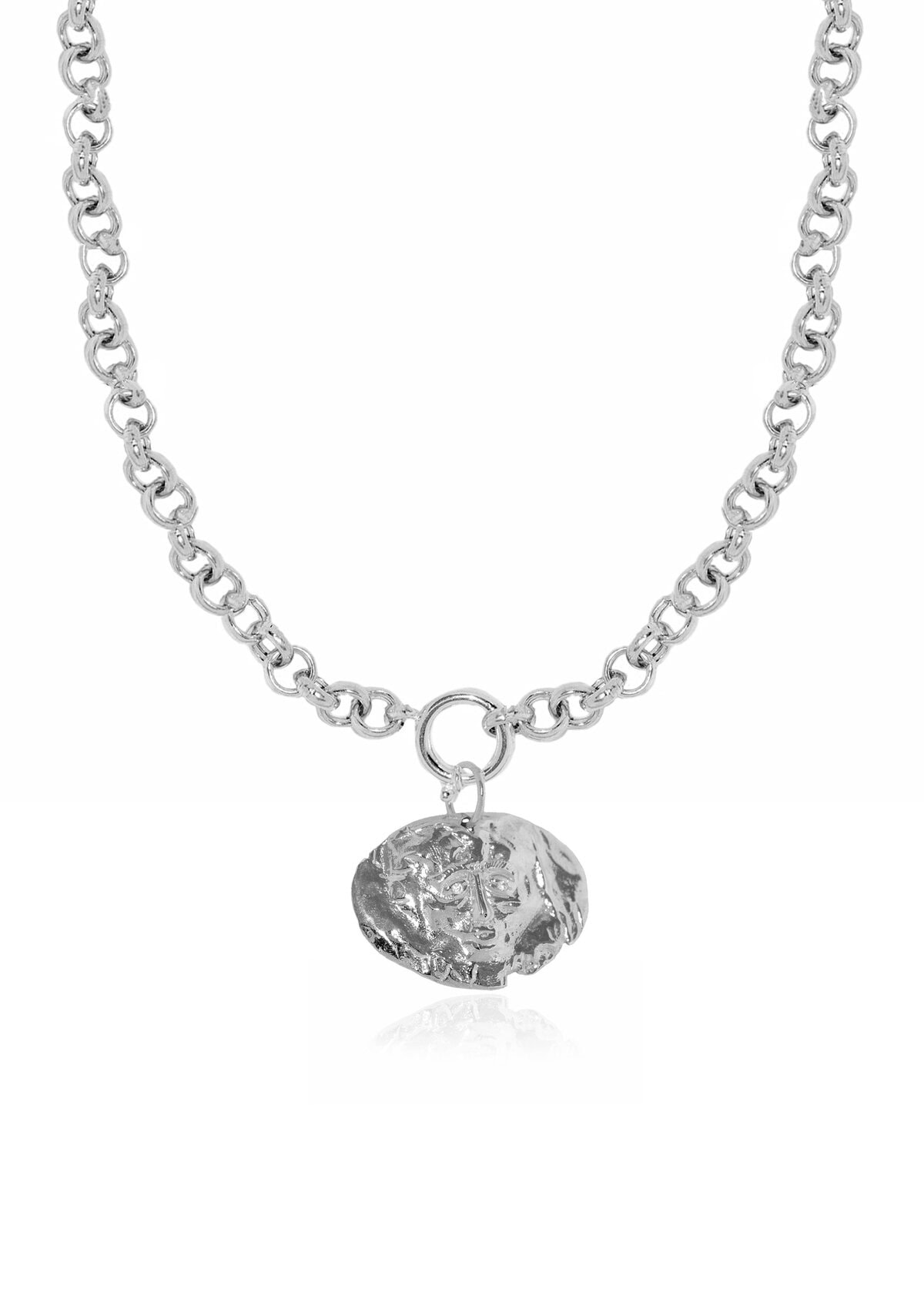 A large round charm inspired by Greek mythology attached on a chunky circle chain.