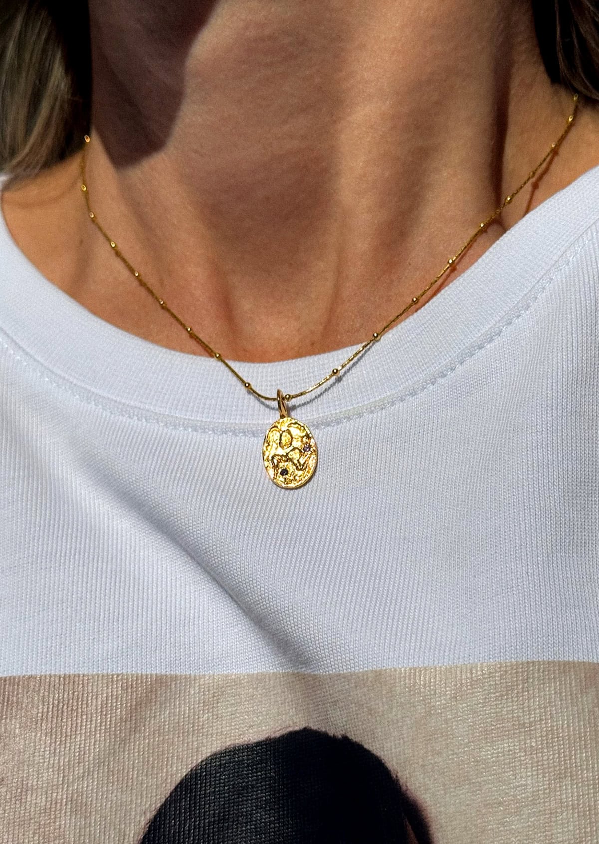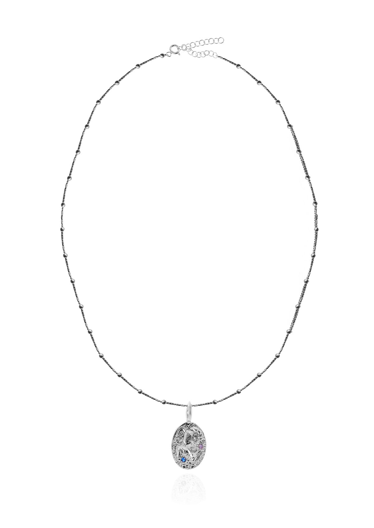 A bejeweled charm inspired by Minoan civilization seals hanging from a dainty chain adorned with tiny metallic elements.