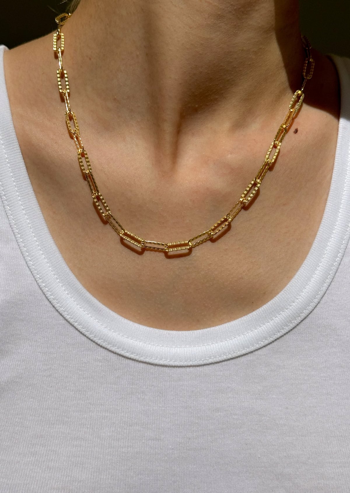 A unique paperclip chain with a rough finish, that adds dimension and an unexpected touch. It can be fastened to any link, offering various styles, from a sexy chain choker to a three layer bracelet. Perfect combined with pearl jewelry.