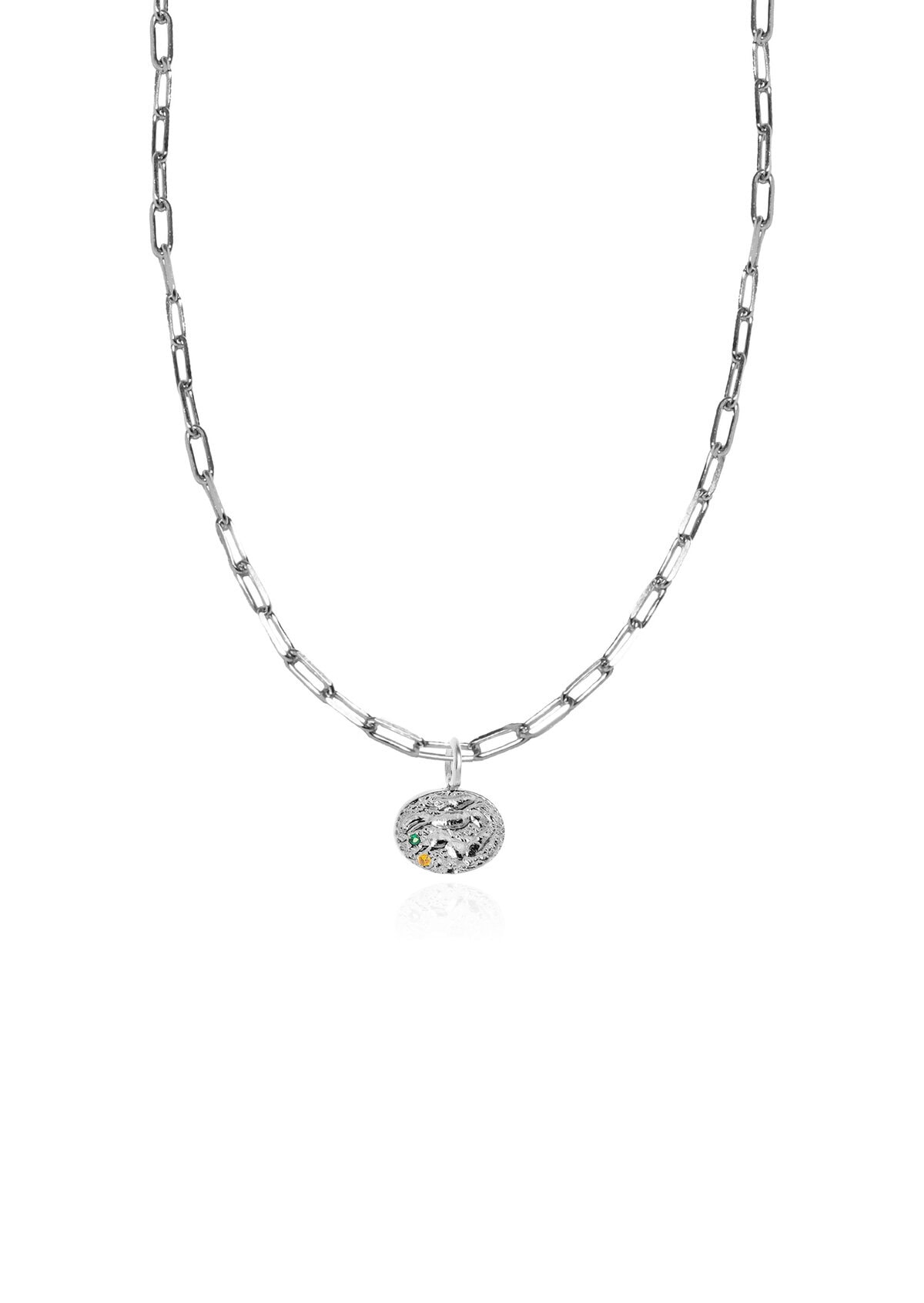 A bejeweled charm inspired by the Minoan civilization, hanging from the Hermina all time classic, versatile, thin paperclip chain.