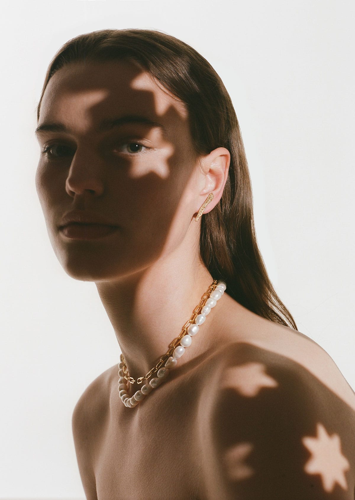 Styling tip: Fasten it tight and say hello to your newest pearl choker. Add longer chains for layering.