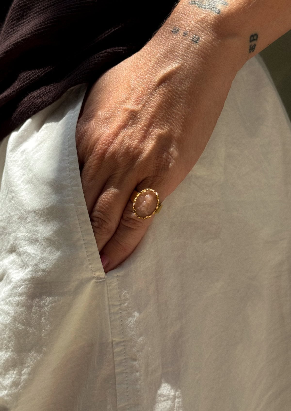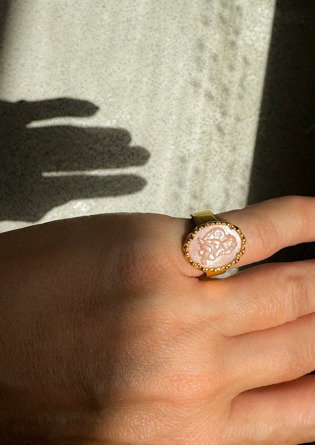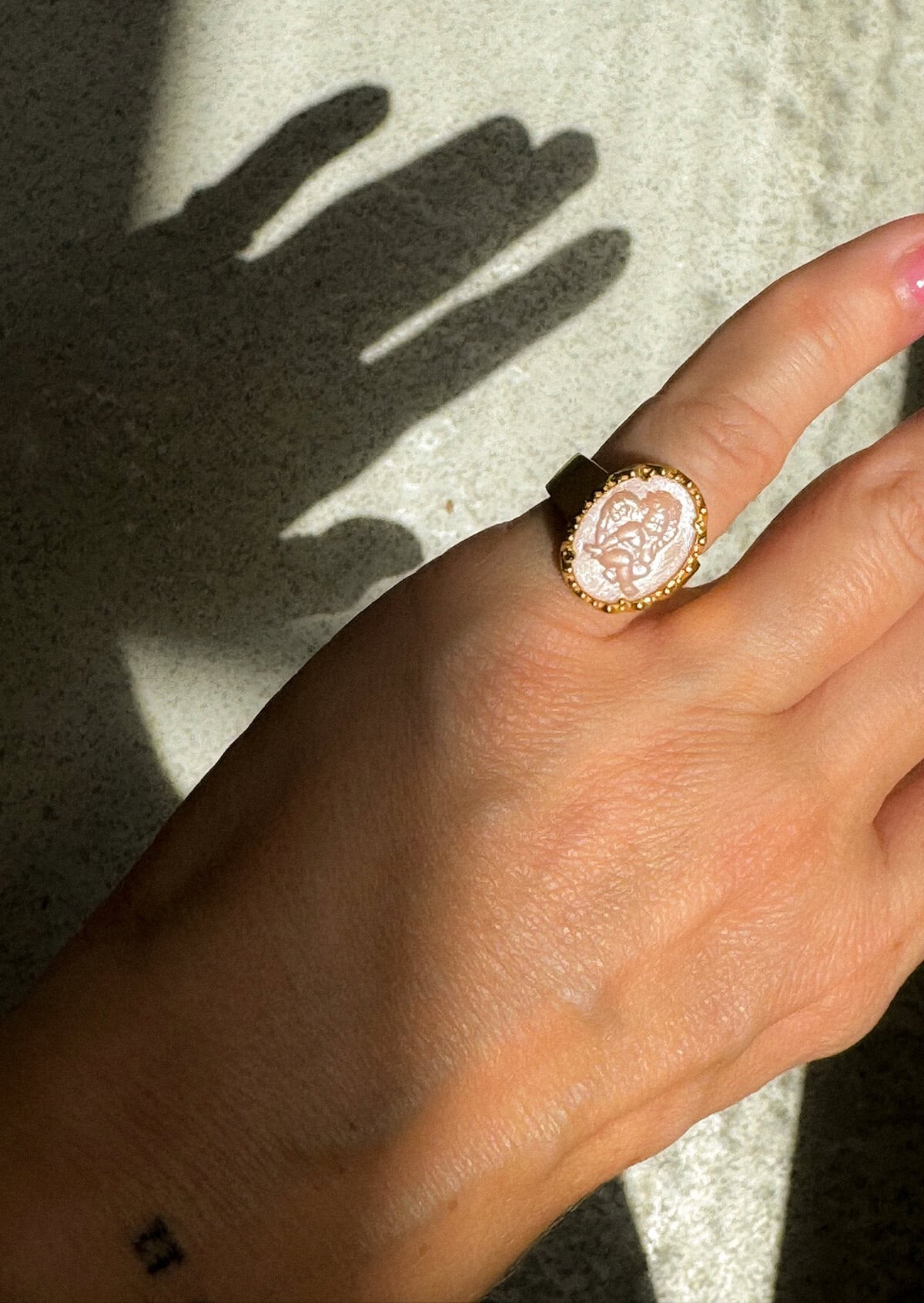 Ancient engravings meet modern day fashion in our new cameo ring featuring Eros, the angel of love, Eros, carved on a moonstone. Moonstone, often linked to the divine feminine is connected to the moon’s energy, promoting intuition and serenity.