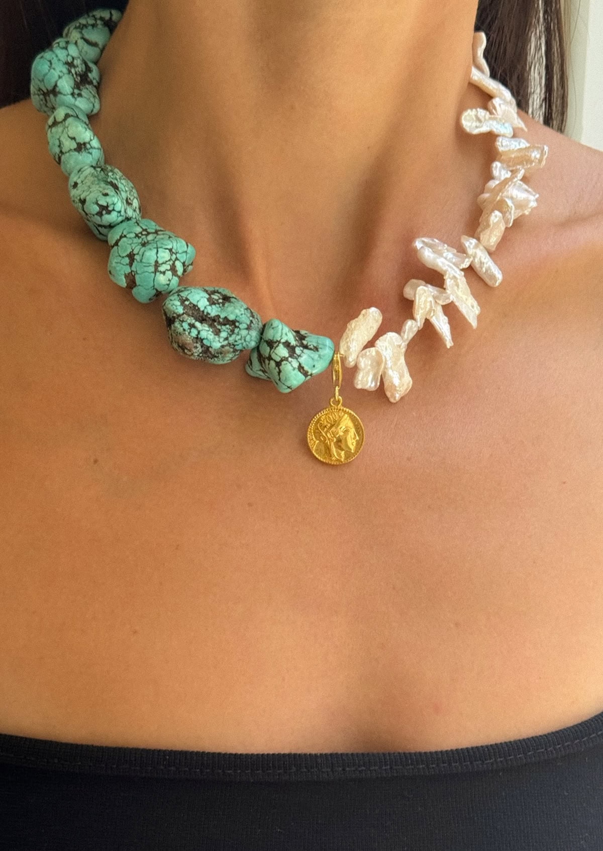 The remake of one of the best selling Hermina jewelry. Half peals and half Turquoise, semi-precious stones. The clip on charm of the goddess of wisdom and protectress of Athens, ‘Athena’, adds a unique touch of the Hermina timeless aesthetic.