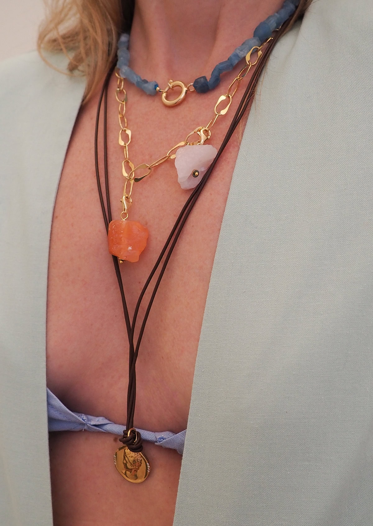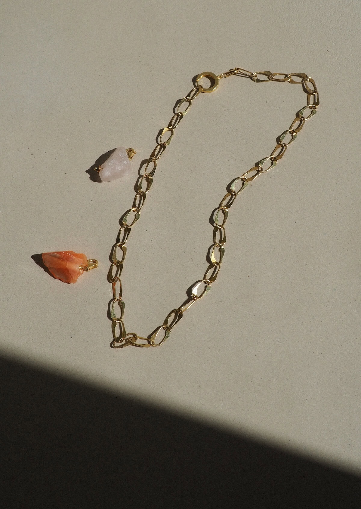 A wide, oval hoop chain that can be fastened to any link, adorned with two chunky semi-precious stones, carrying positive properties. Quartz is a perfect stone for love and healing whilst orange boosts relaxation and joy. Uplifting jewelry!