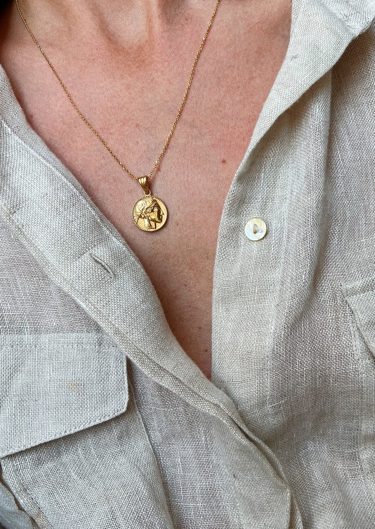 A classic thin chain adorned with a charm depicting the ancient Greek goddess Athena. Stylish and subtle, this is the perfect piece for layering.