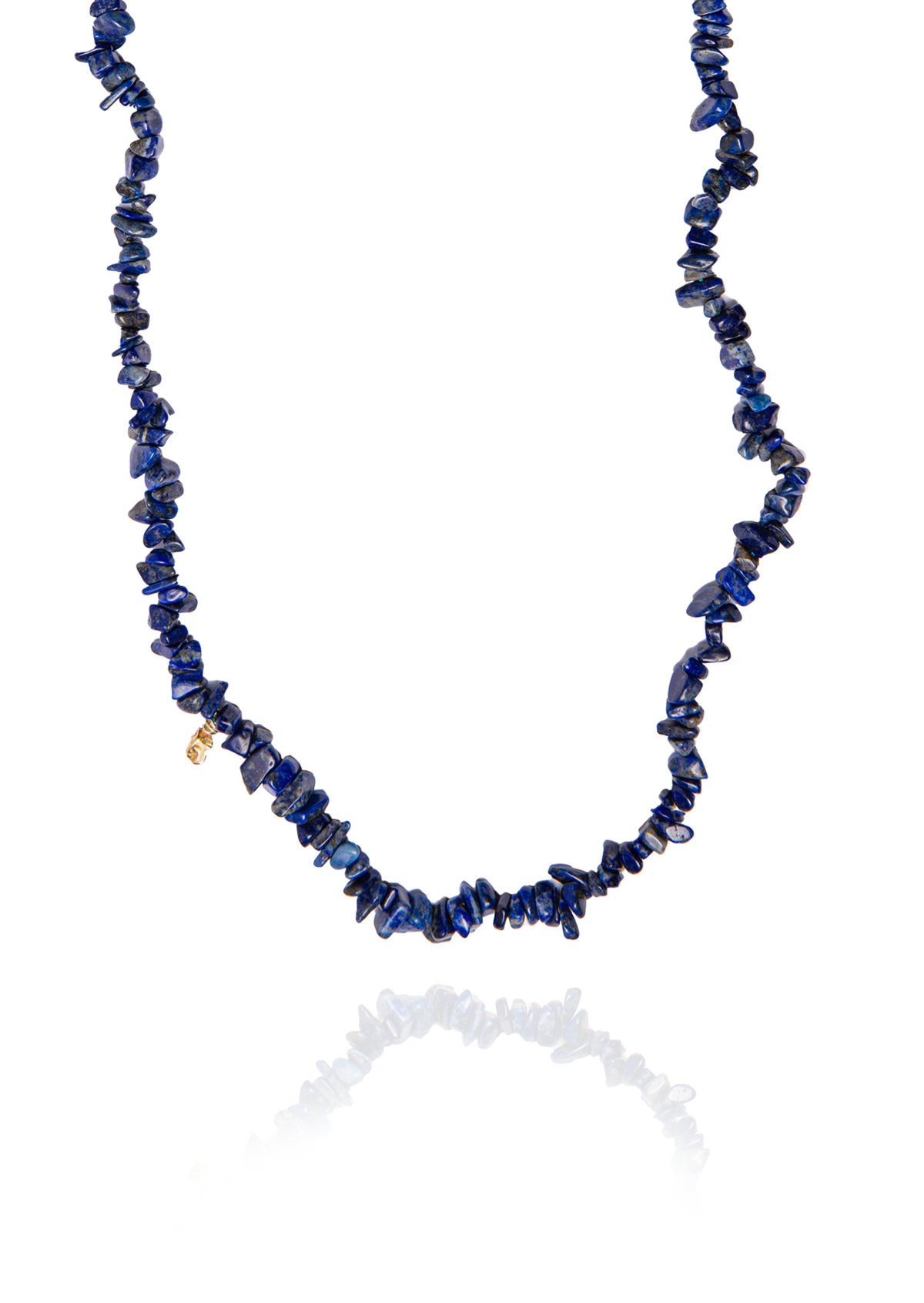 A dreamy blue necklace comprised of semi-precious chips, adorned with a gold element.
