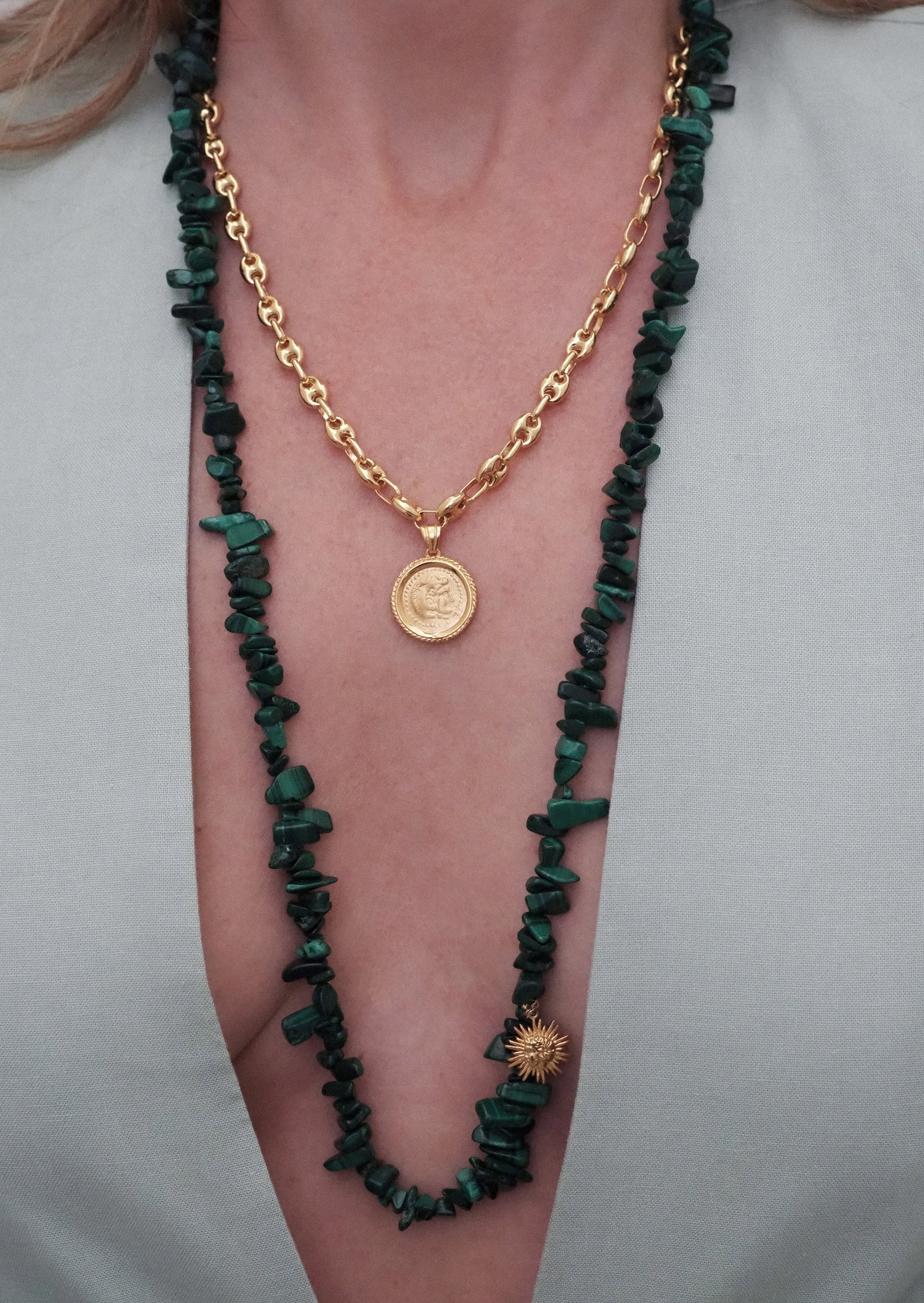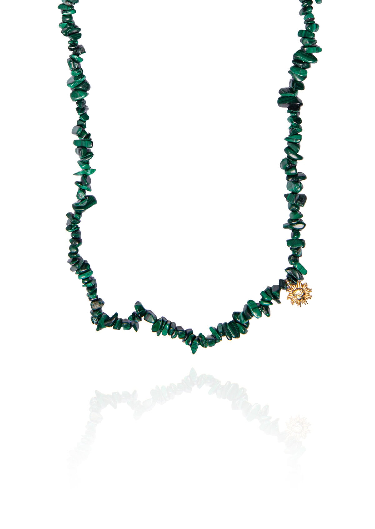 A forest green necklace comprised of semi-precious chips, adorned with a pocked-sized sun charm.