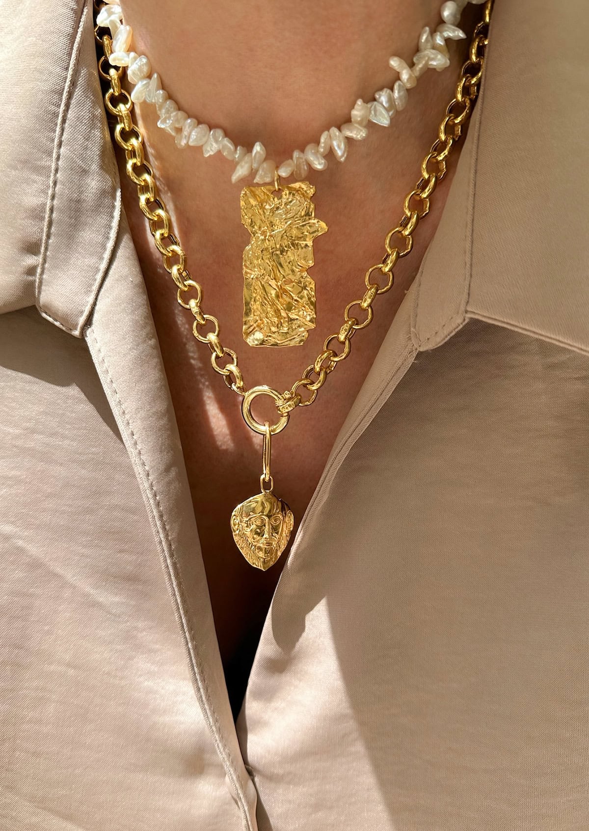 An angel-like figure of the Greek goddess of Victory, Nike charm dipped in a delicious layer of gold hanging from an asymmetric pearl chips necklace. The classic allure of pearls with a twist.