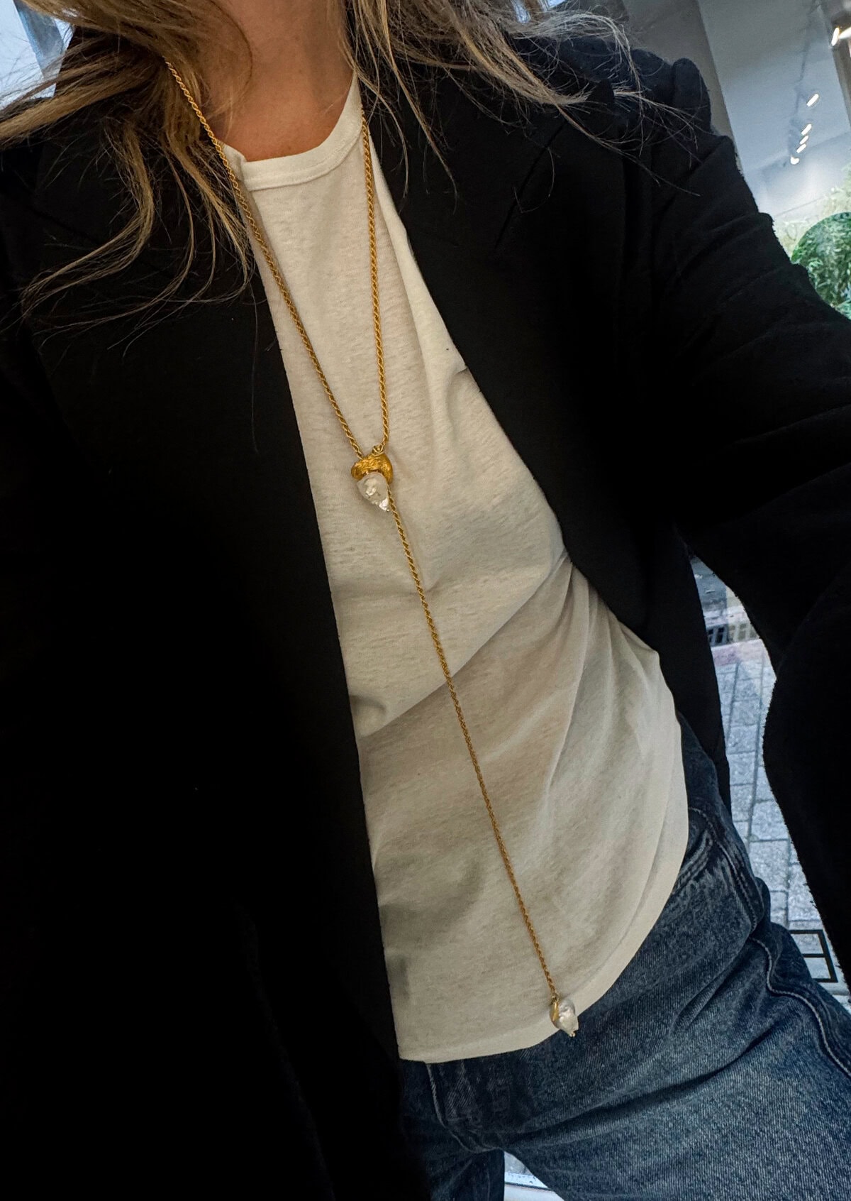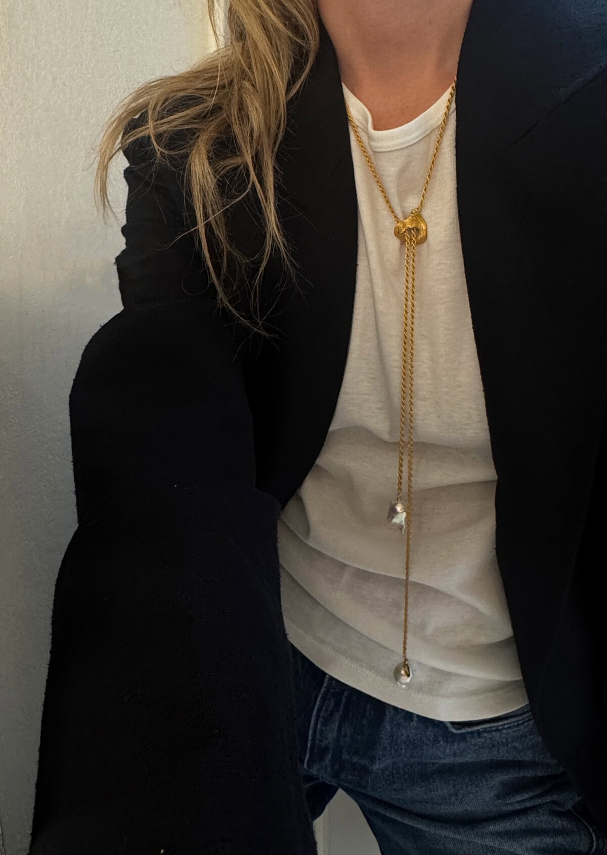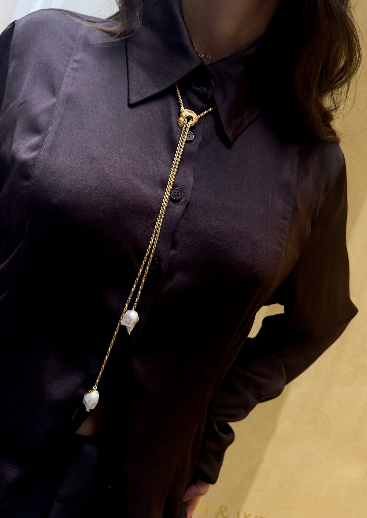 A thick twisted chain cravatte necklace fastened with an intricate, vintage-like, heart-shaped clasp, adorned with two baroque pearls. A versatile piece that can be worn tight as a choker or hang loose on your chest for a more laid-back style.