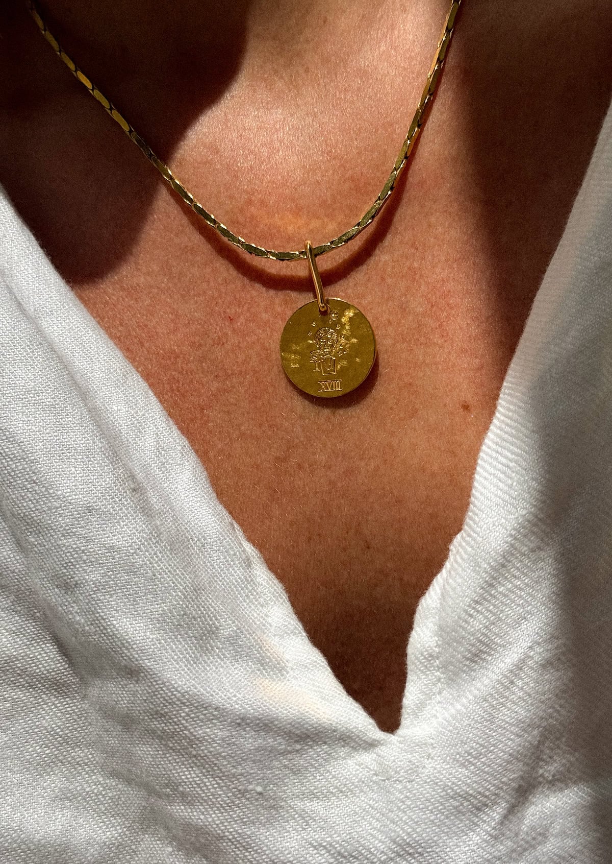 Combine the gold-plated charm necklace with earthy tones and show off your black outfits with the silver charm