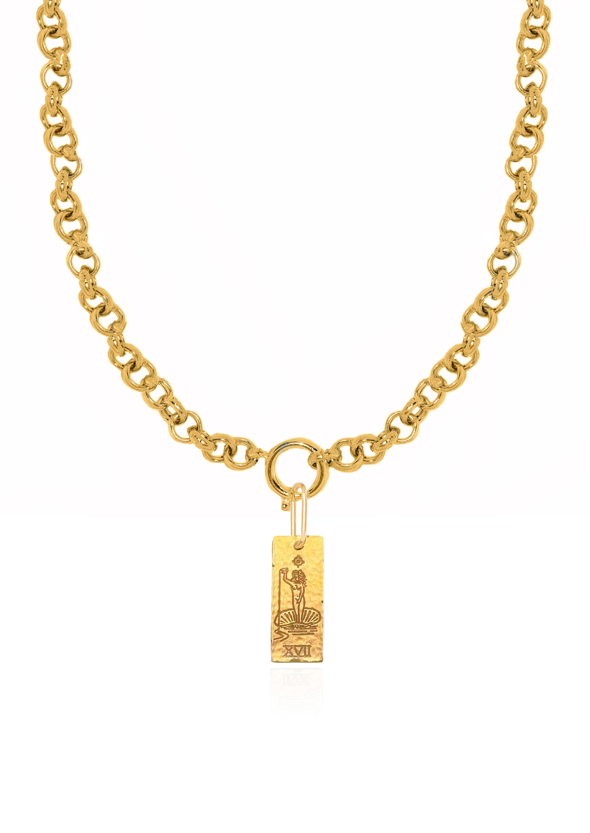 A circle chain necklace adorned with a charm depicting Aphrodite, thee ancient Greek goddess of love, beauty, and pleasure. An ultra-feminine piece charged with the allure of the ultimate beauty archetype. Jet-set jewelry.