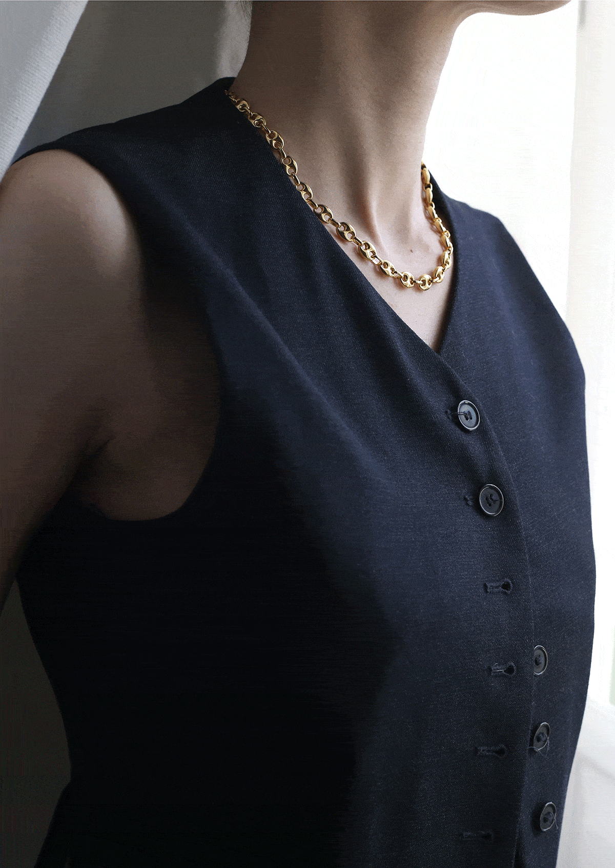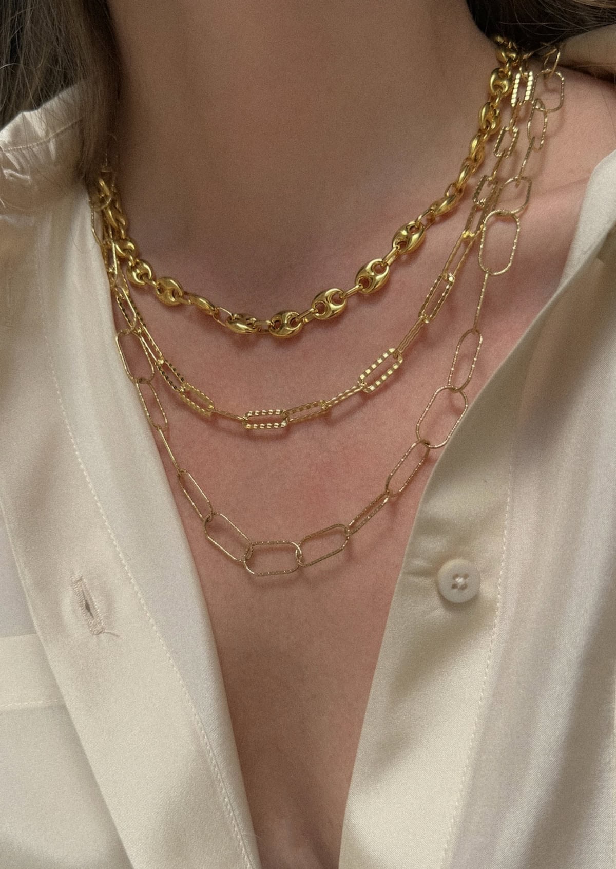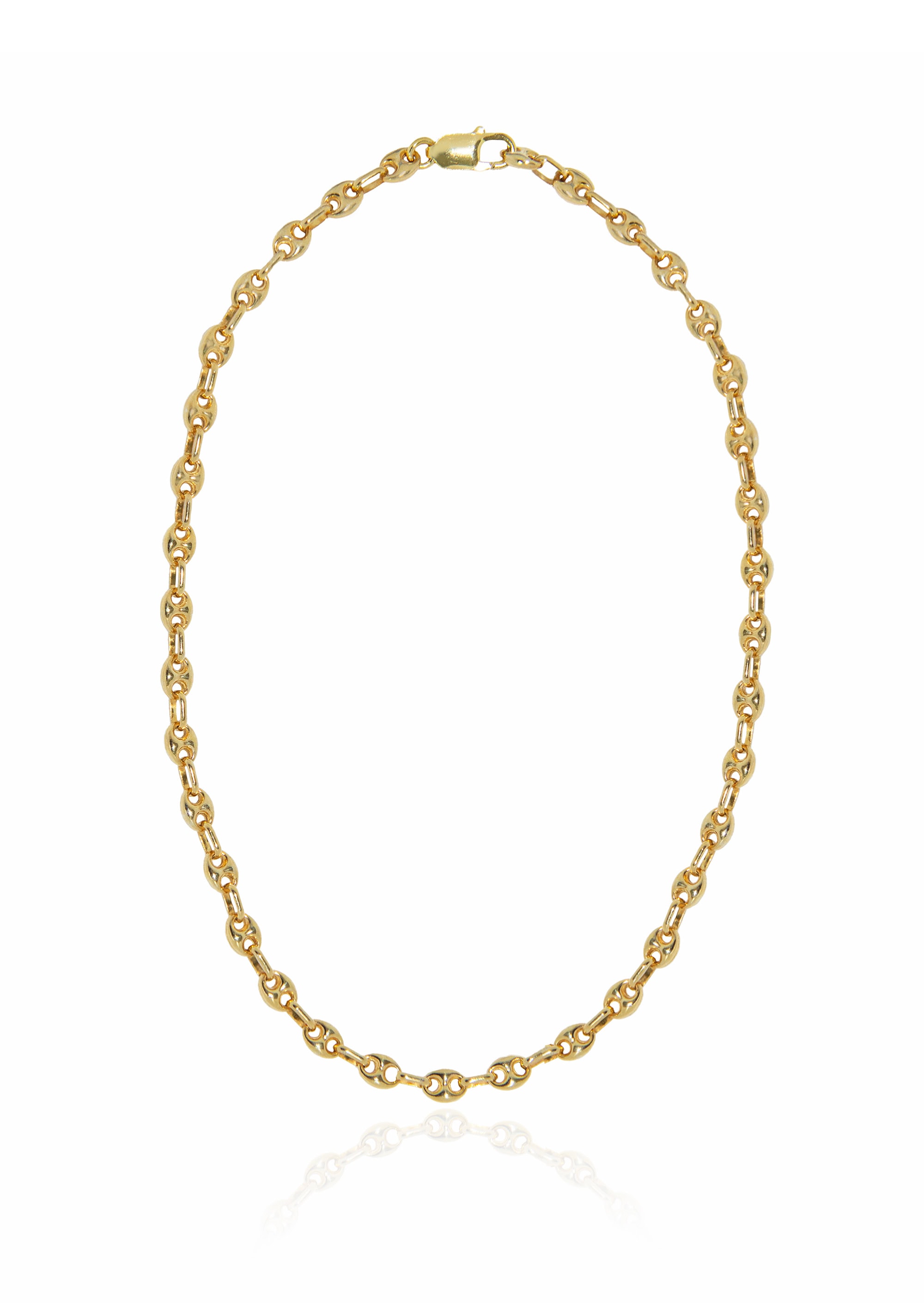 A contemporary chain with links reminiscent of the Greek letter Θ (theta). The chain can be fastened to any link, offering multiple styling options.
