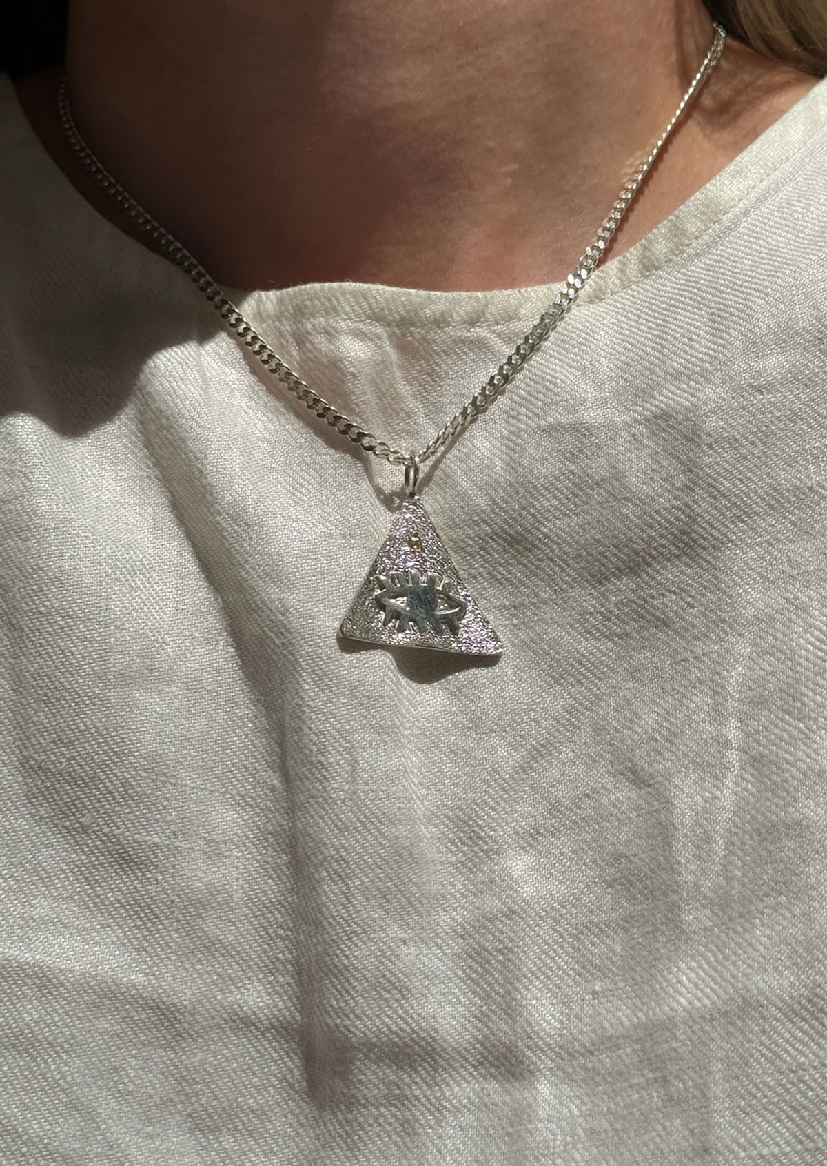 The signature Kressida Pyramis charm hanging from a versatile chain. An all-weather piece, and the perfect base for layering.