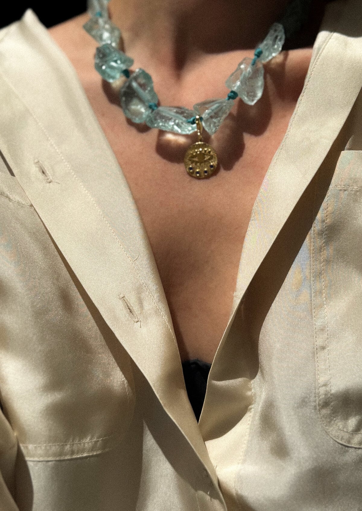 A chunky aqua stone necklace in a dreamy baby blue hue, adorned with the emblematic Kressida charm. The eye is a powerful symbol of protection, filtering energy while aqua enhances healing and harmony of the body and mind. More than a statement piece of jewelry, this piece is packed with all the good vibes you need to show up confident and powerful on any occasion.