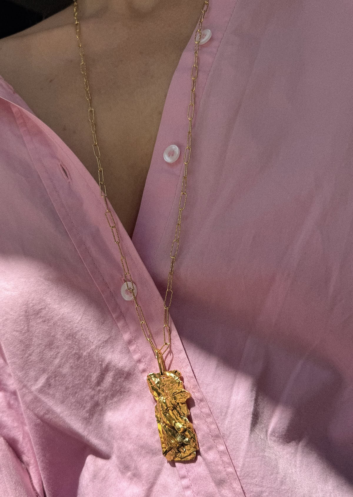 An elegant, narrow link paperclip chain necklace adorned with a large foil charm depicting the angel-like figure of the Greek goddess of Victory, Nike, in sterling silver or dipped in a delicious layer of gold. The chain can be fastened to any link, offering various styling options.