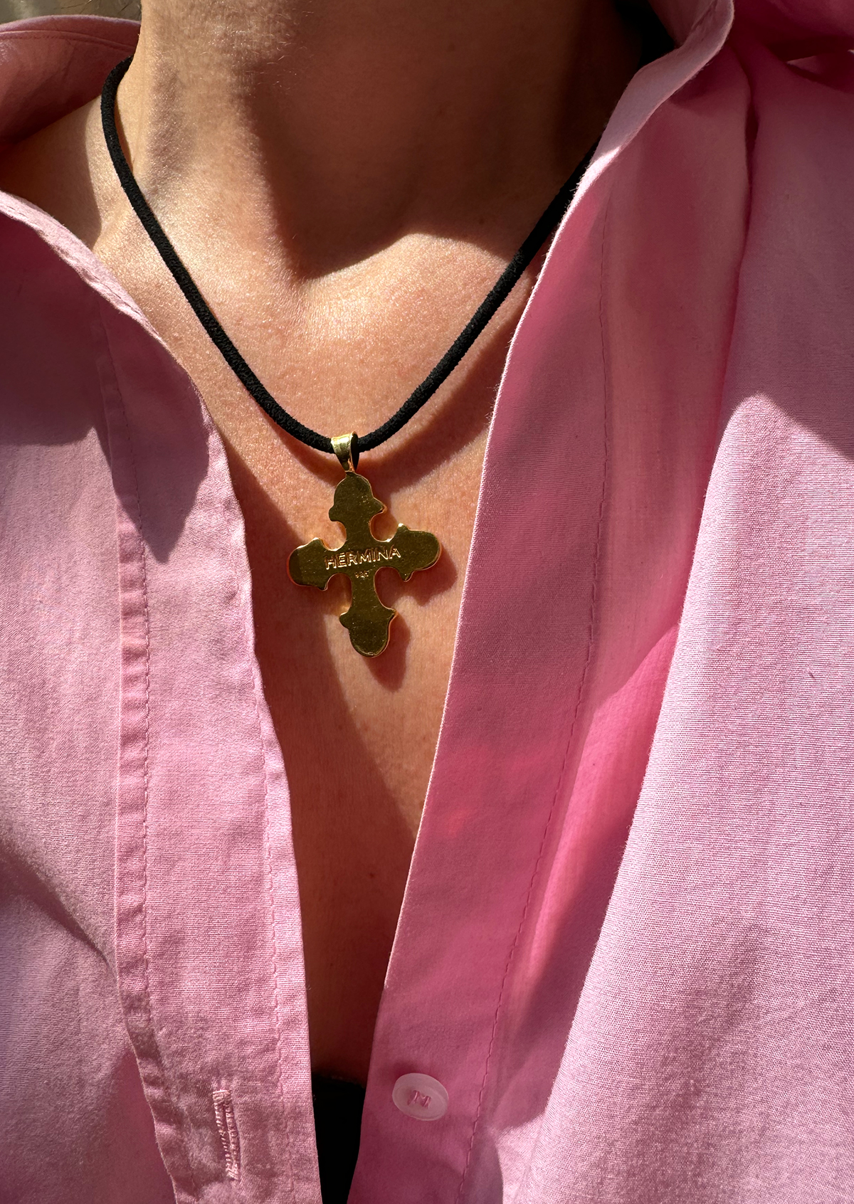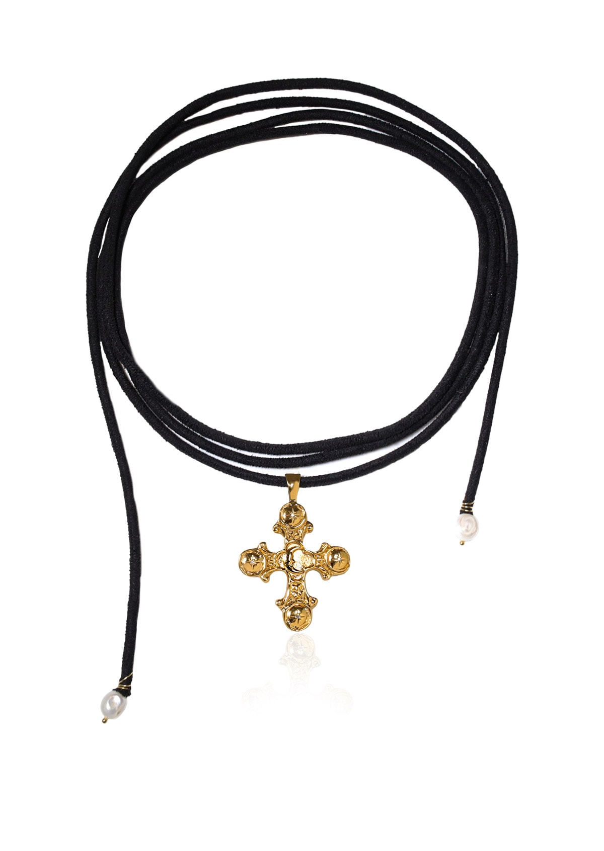 Modern day baroque meets fine jewelry staple in this contemporary cross charm.