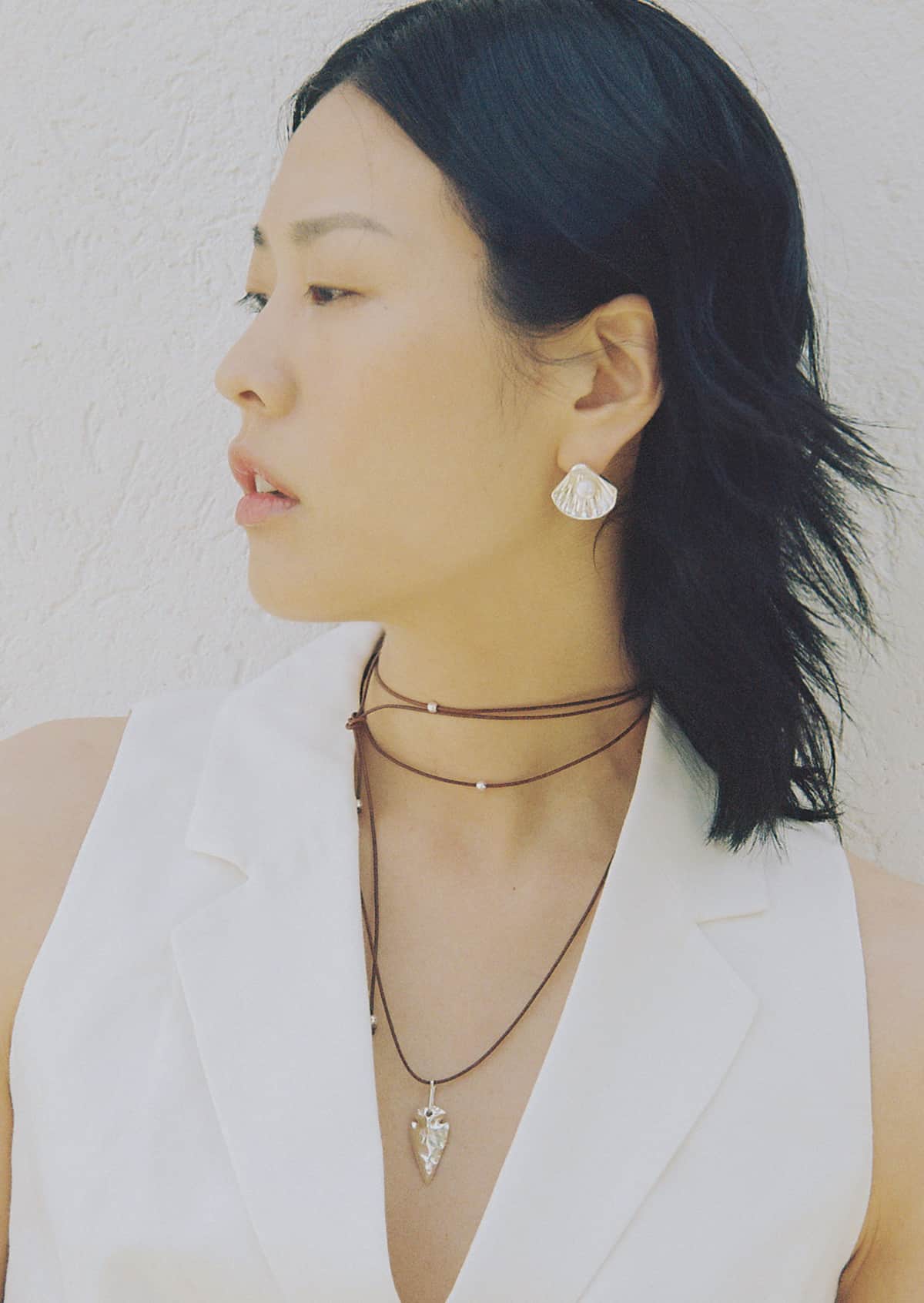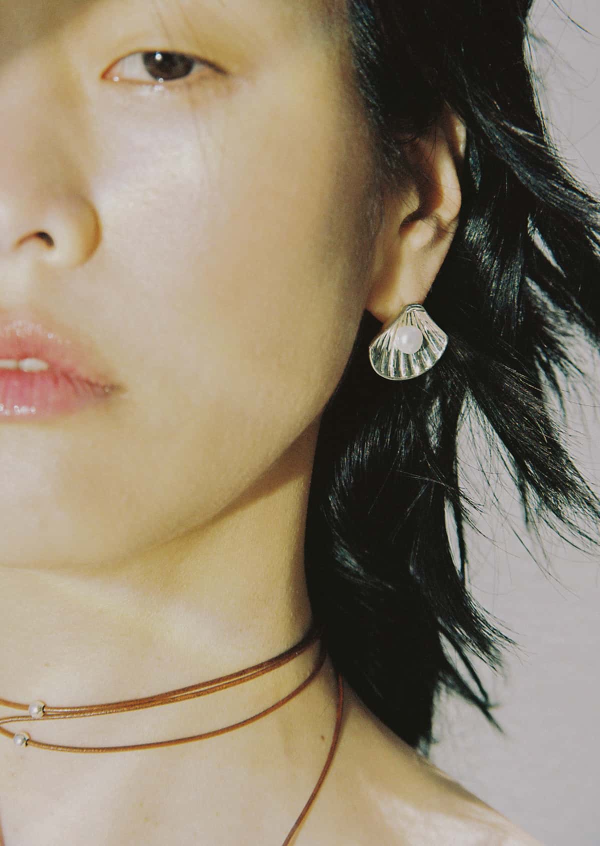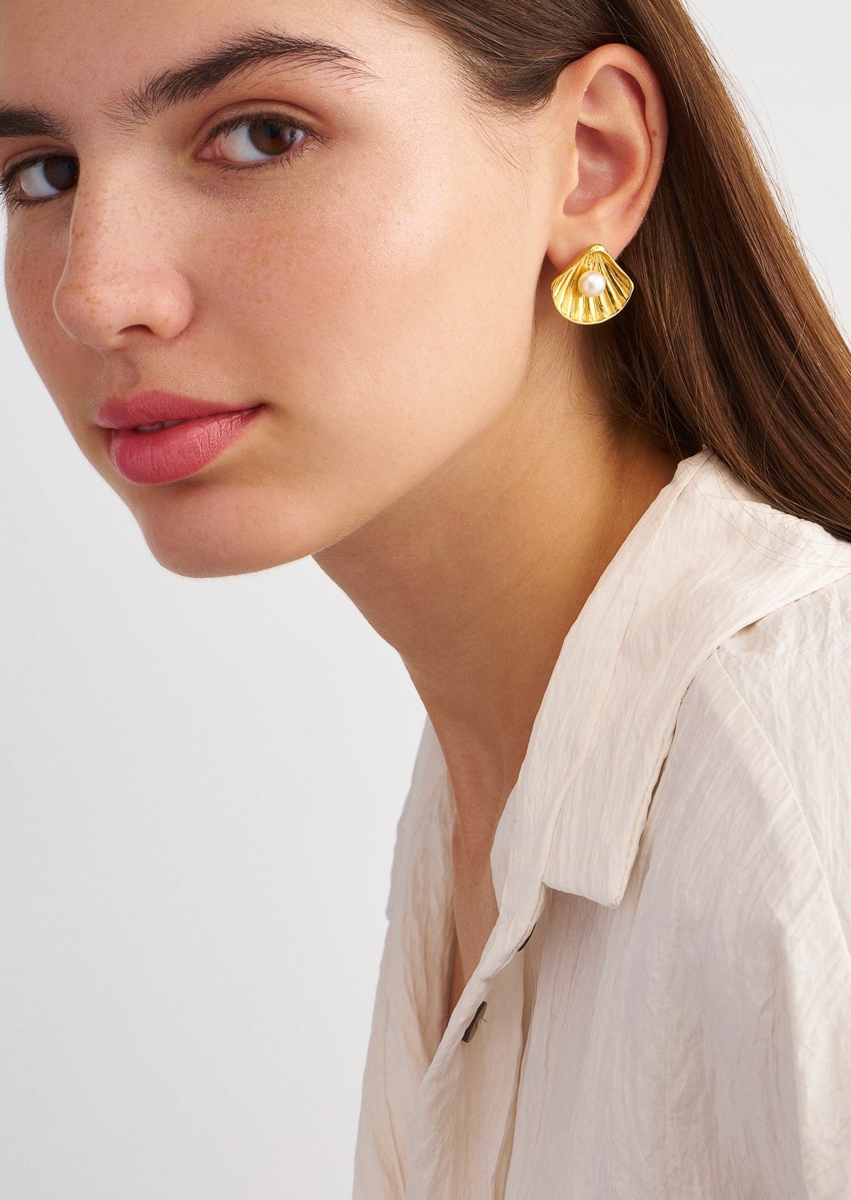 A pair of face-framing, seashell- shaped earrings adorned with a pearl that will instantly lift up your mood- and your style! Pearls tend to reflect the light, adding glow to the complexion. Combine with a minimal cord necklace for an unexpected look.