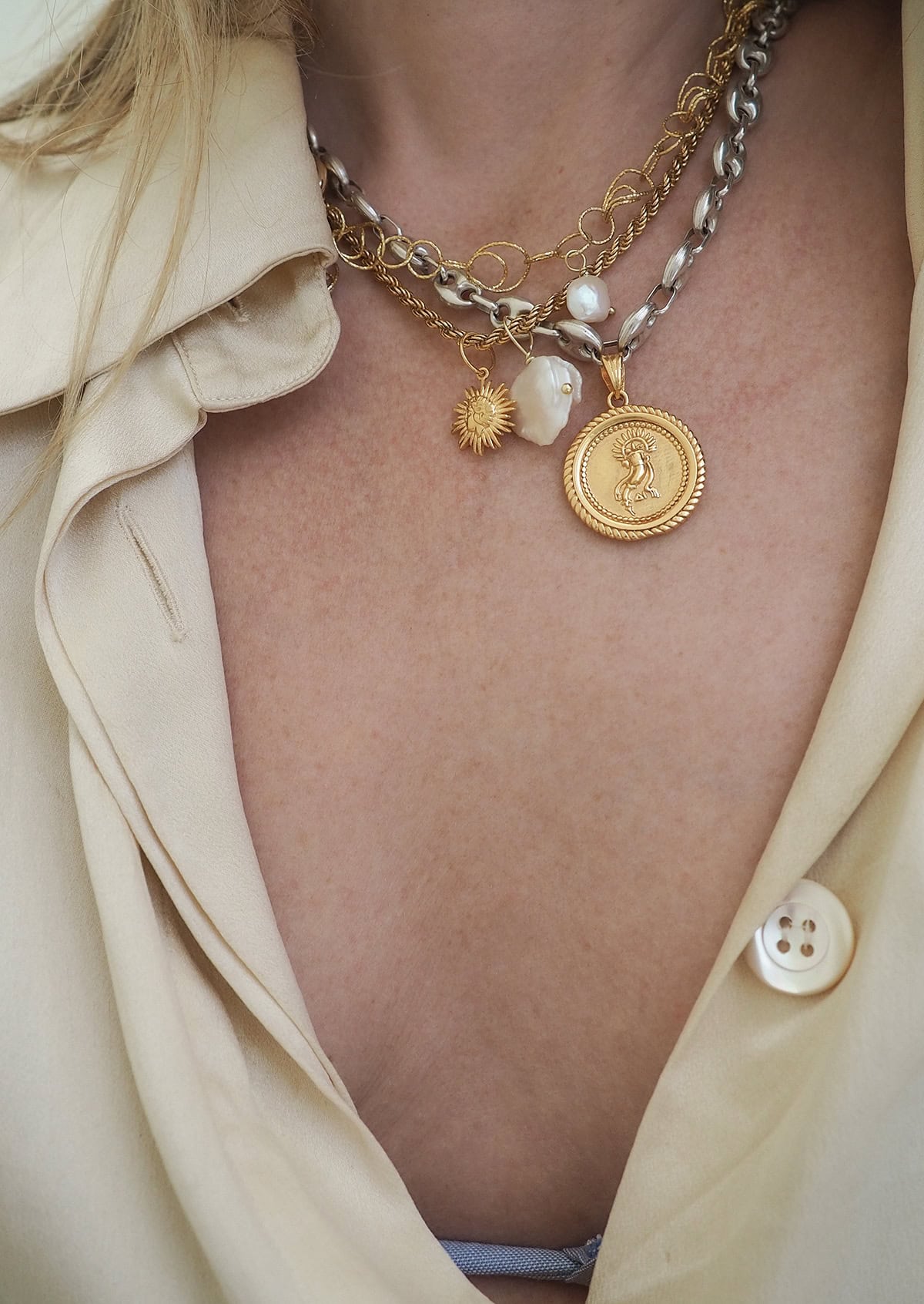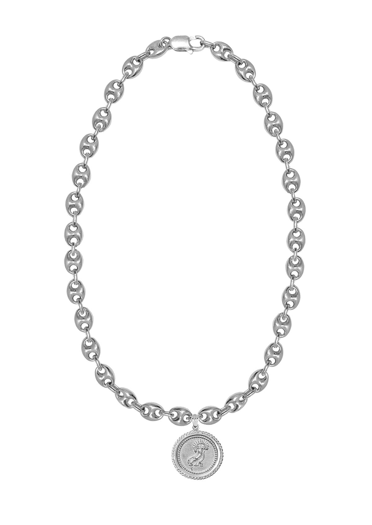A contemporary chain necklace with wide links reminiscent of the Greek letter Θ (theta), adorned with a charm, inspired from ancient Greek mythology, depicting the horn of Amalthea. Amalthea was the goat that nurtured infant Zeus during the years he was growing up hidden from his father Cronus. One day, as Amalthea played with little Zeus, he accidentally broke off her horn. To make up for it Zeus made the broken horn always be full of whatever its owner desired.