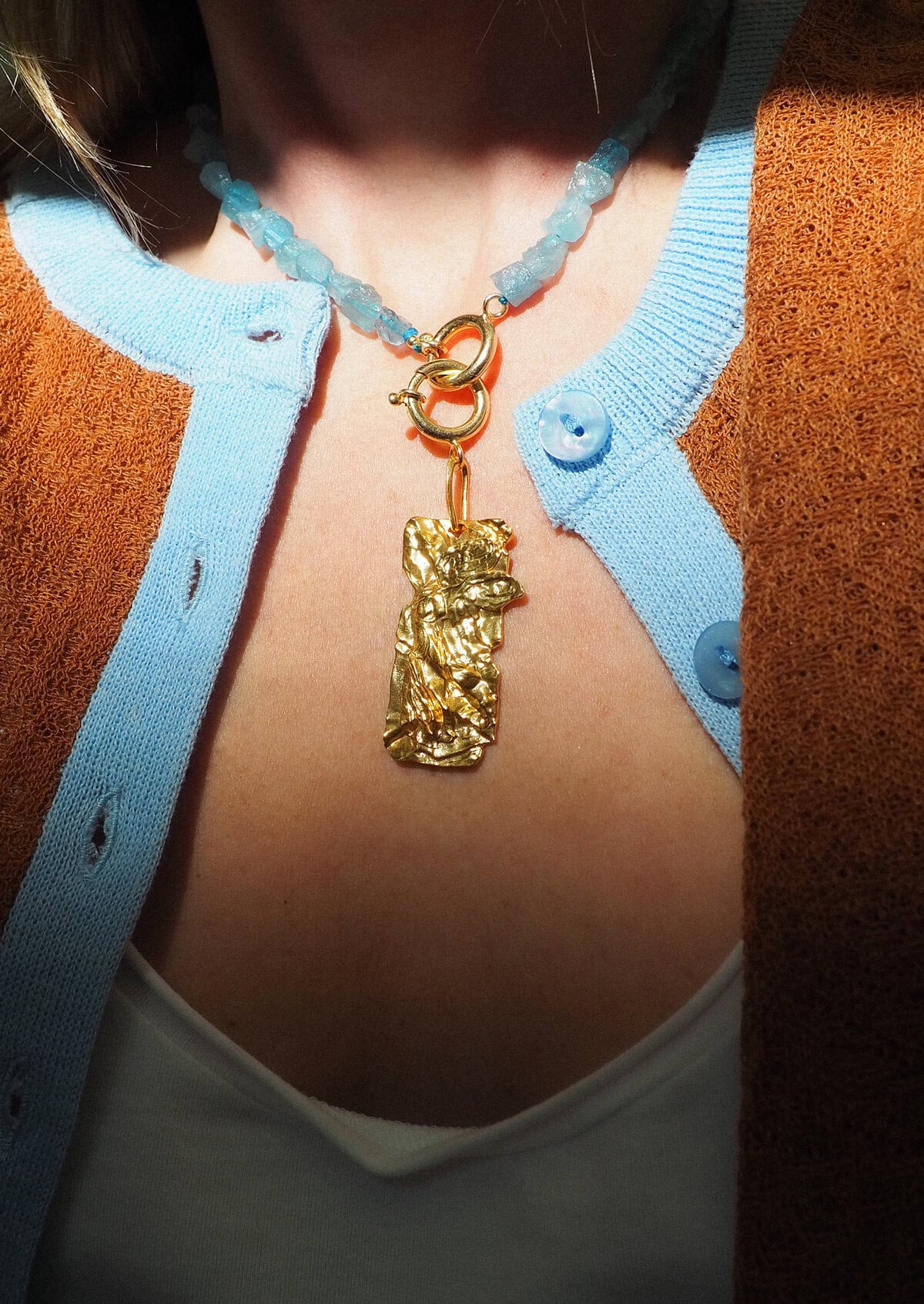 A large, rectangular charm depicting Nike, the Greek goddess of victory, dipped in a delicious layer of gold or silver hanging from a wide clip-on that can be attached anywhere, spicing up your look. Shining bright, this piece will gather all eyes on you.