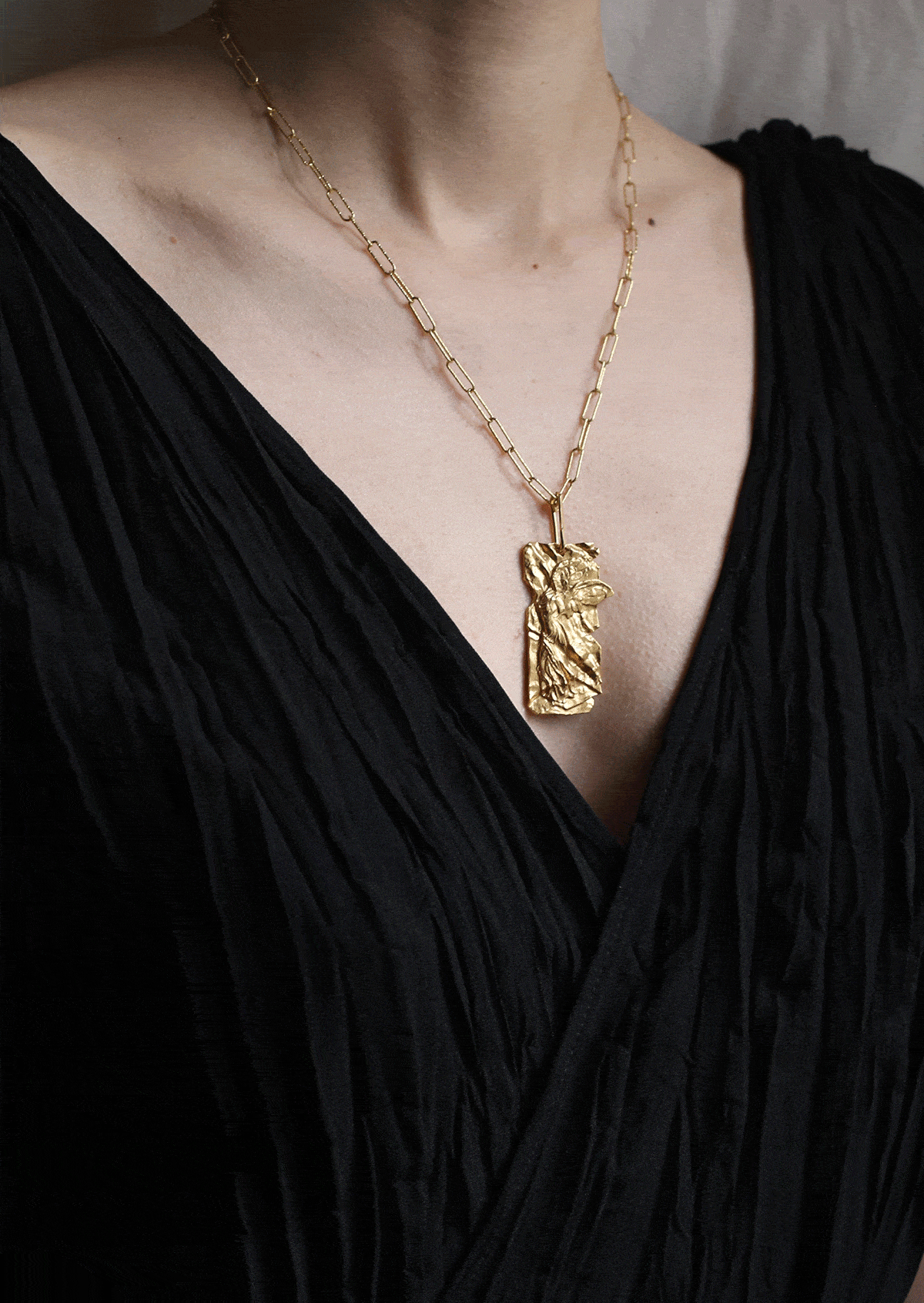 An angel-like figure of the Greek goddess of Victory, Nike charm in sterling silver or dipped in a delicious layer of gold. Pair with your favorite chain or pearl necklace.
