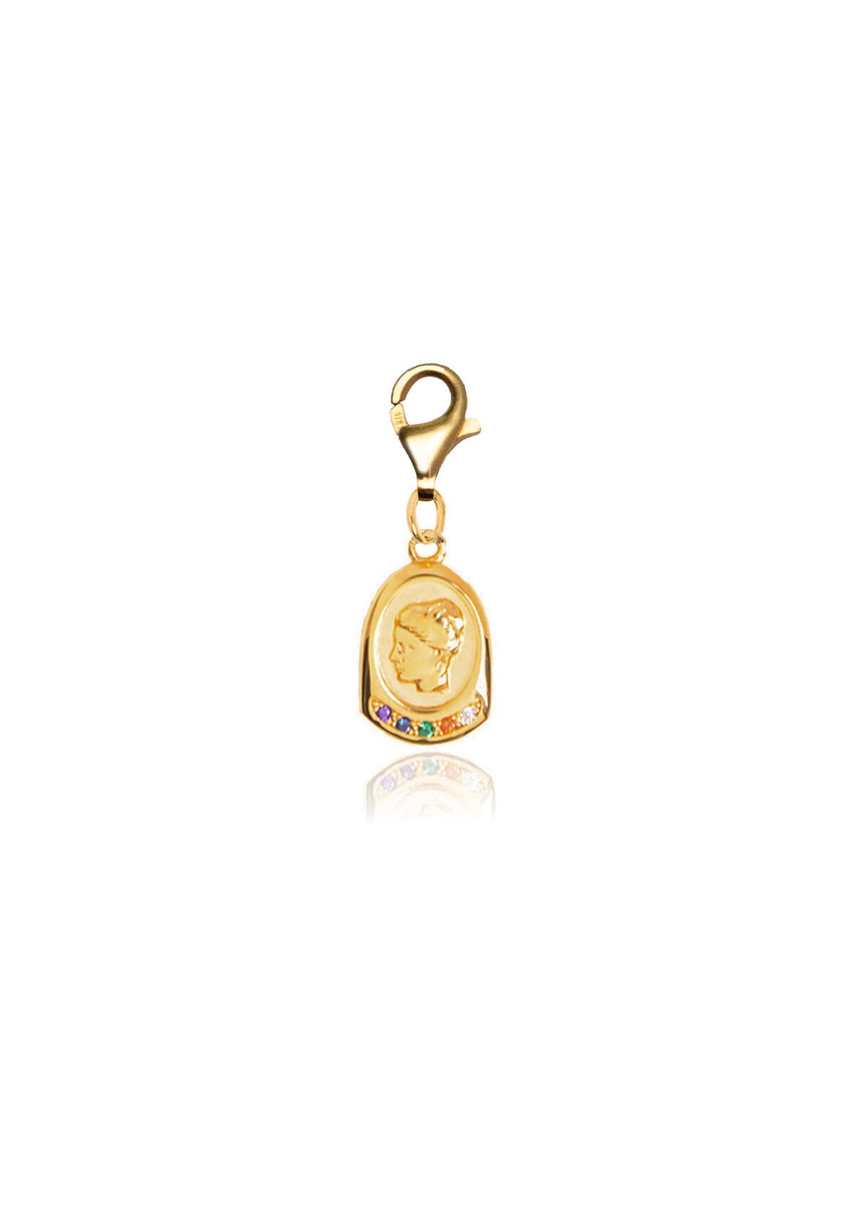 An elegant charm depicting the Greek goddess of health, and adorned with 5 mocca zirconia gemstones. More than a beautiful charm, it works as an amulet of protection. Pair it with our chain and beaded necklace collection and create a custom piece only for you.