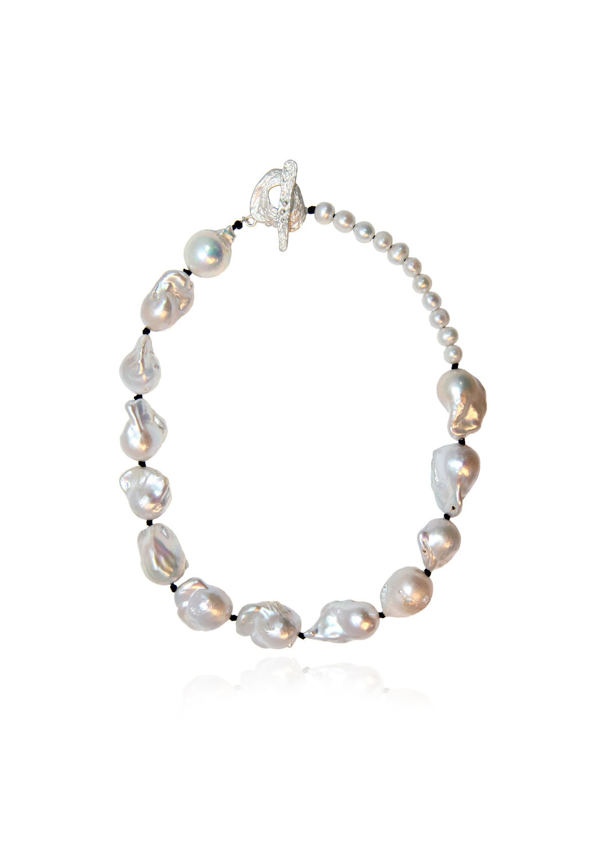 Not your usual pearl necklace! Comprised of baroque pearls set apart by thread knots and a few tiny pearls, featuring a vintage heart-like shaped clasp, this a quirky alternative to your classic pearls.