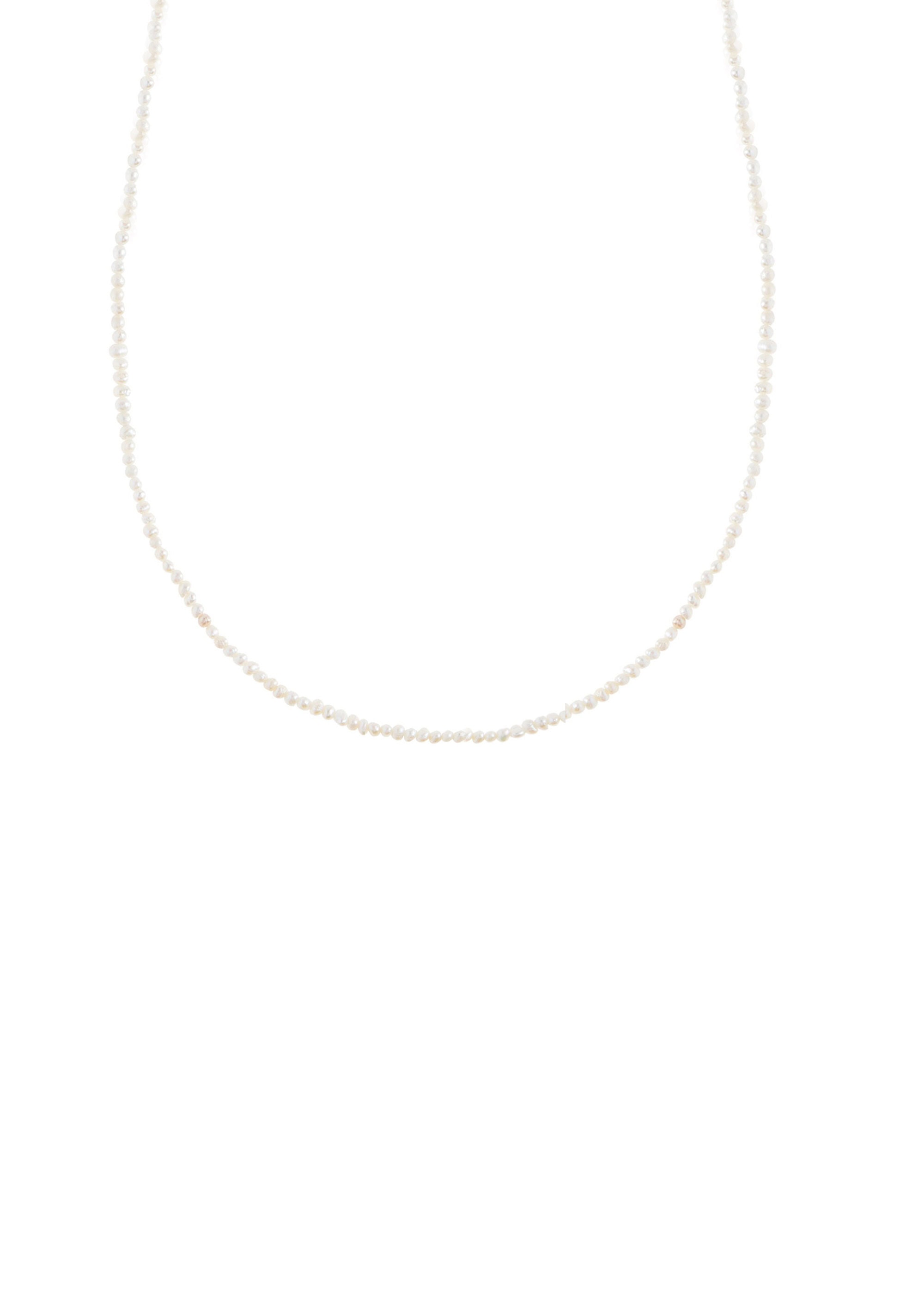 A vintage-like, pearl necklace with a 5 cm extension allowing a versatile length, for a classic, minimalistic look. -
