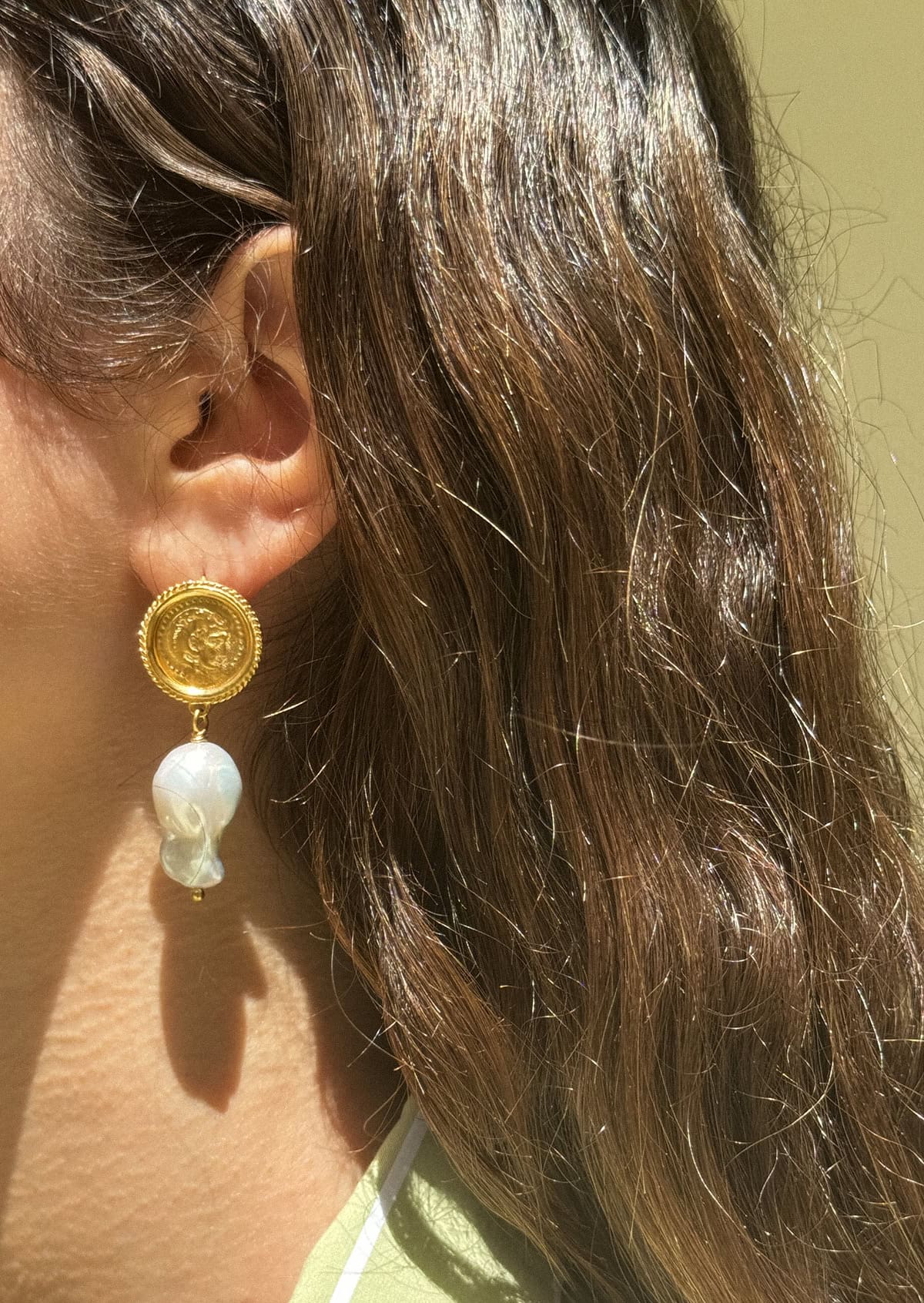 Finished with a baroque freshwater uniquely shaped pearl, they depict the heroic semi-God Hercules who attained divine status by accomplishing 12 tasks on Earth, known as the 12 Labors of Hercules. He was greatly admired by Alexander the Great who created a coin in his honor.