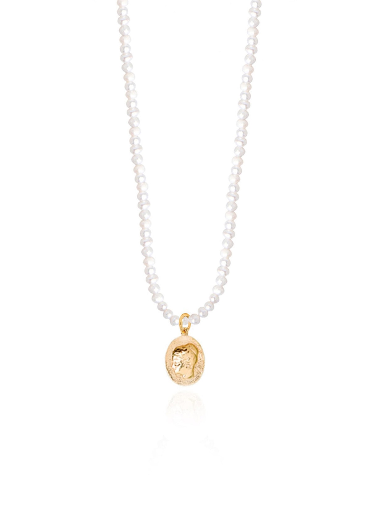 A pearl necklace adorned with a charm depicting the ancient Greek goddess of Health. Perfect from day to night.