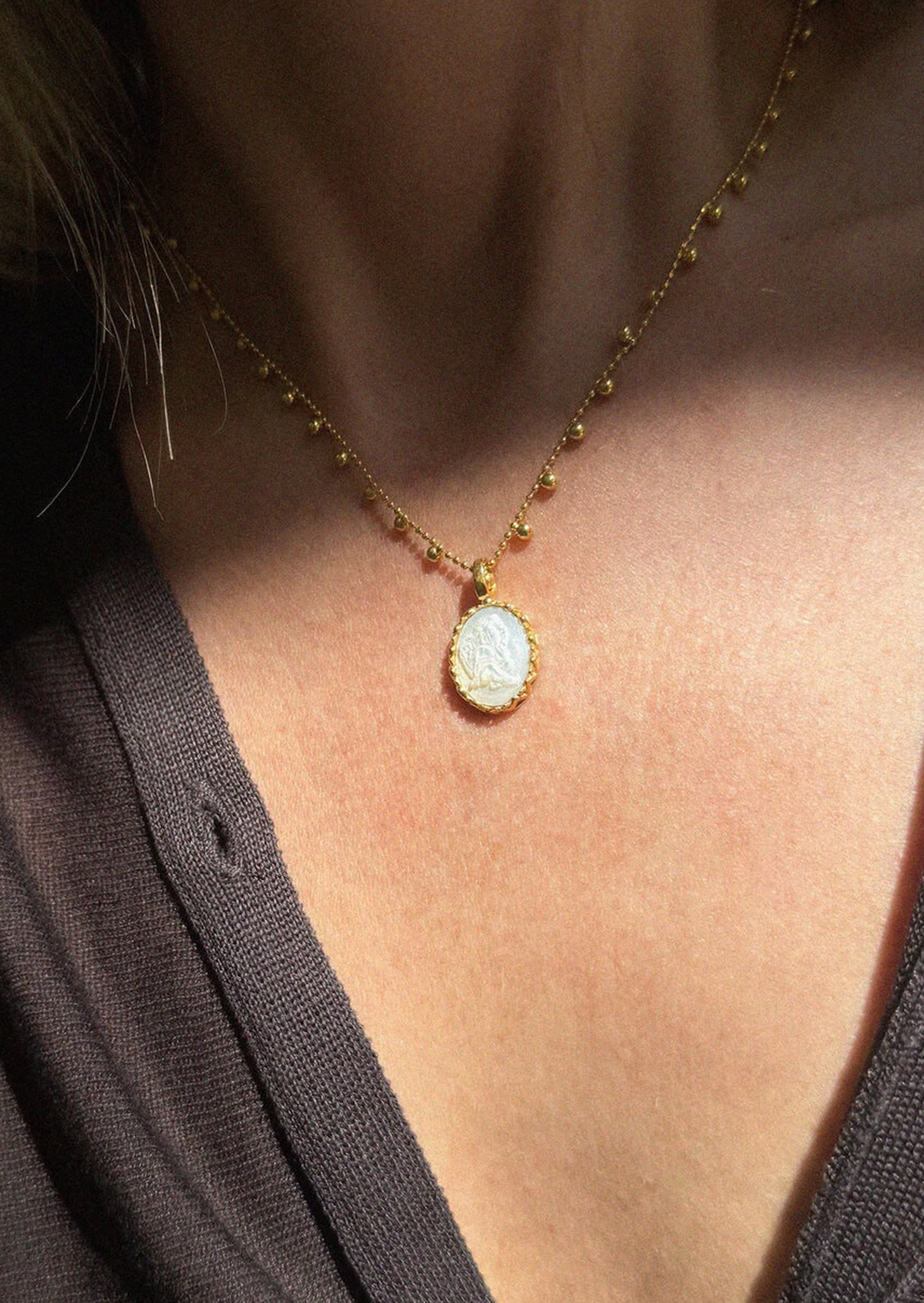 Ancient engravings meet modern day fashion in our new cameo charm necklace featuring the angel of love, Eros, carved on a mother of pearl stone, hanging from a dainty chain, adorned with tiny metallic elements.