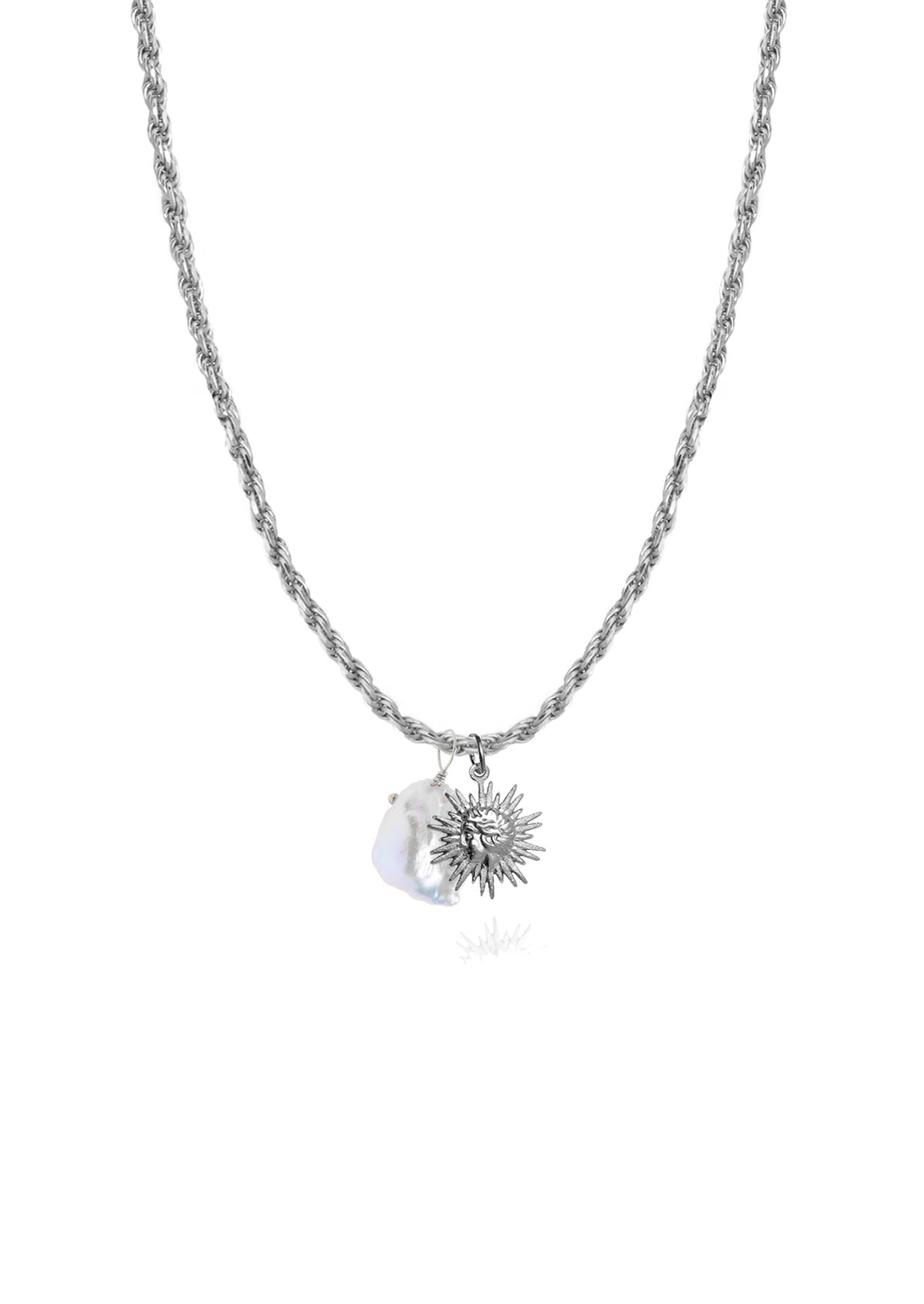 A chunky rope chain adorned with a mini sun and a baroque pearl charm. The perfect base for layering. Play around and add more charms for a customized look.