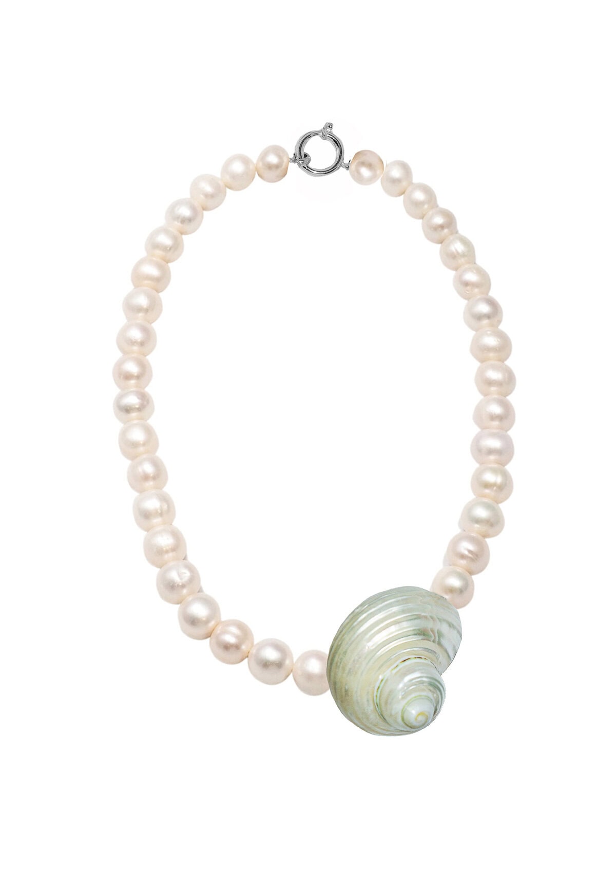 An exclusive, round pearl necklace adorned with a lustrous, oversized natural seashell.