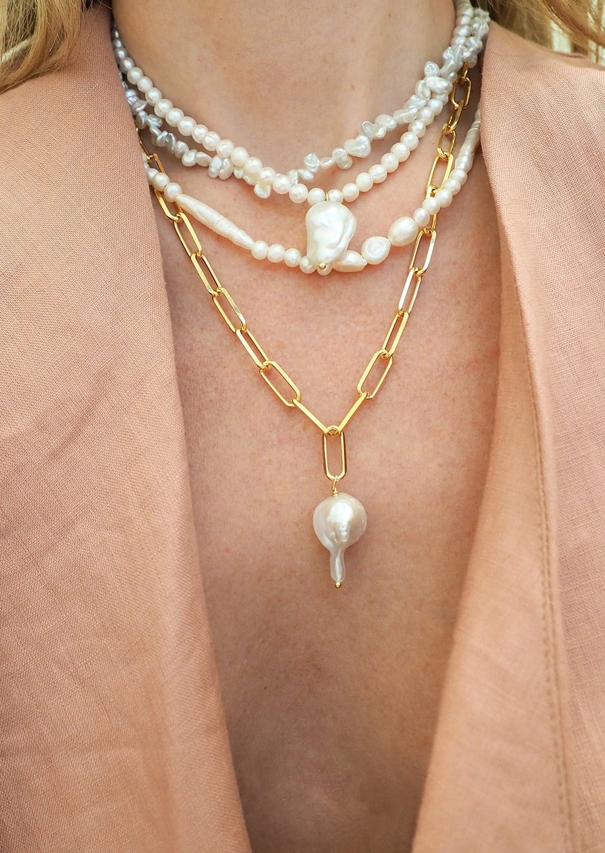 One string of classic round pearls tangled with one string of irregular pearls, finished off with a chunky baroque pearl. A classic piece with a contemporary twist that will instantly polish up your look.