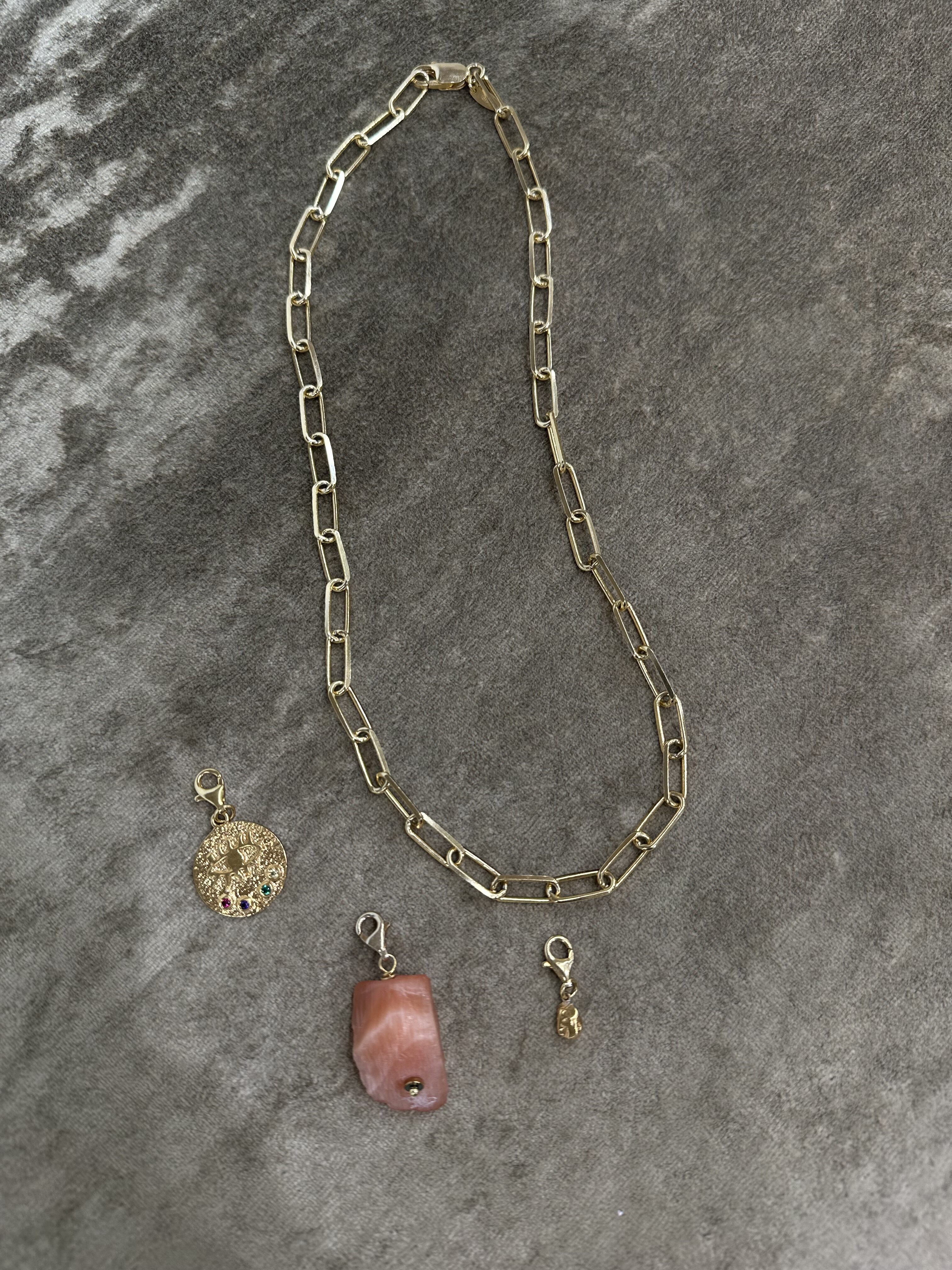A statement, wide-link chain adorned with three dreamy clip-ons: