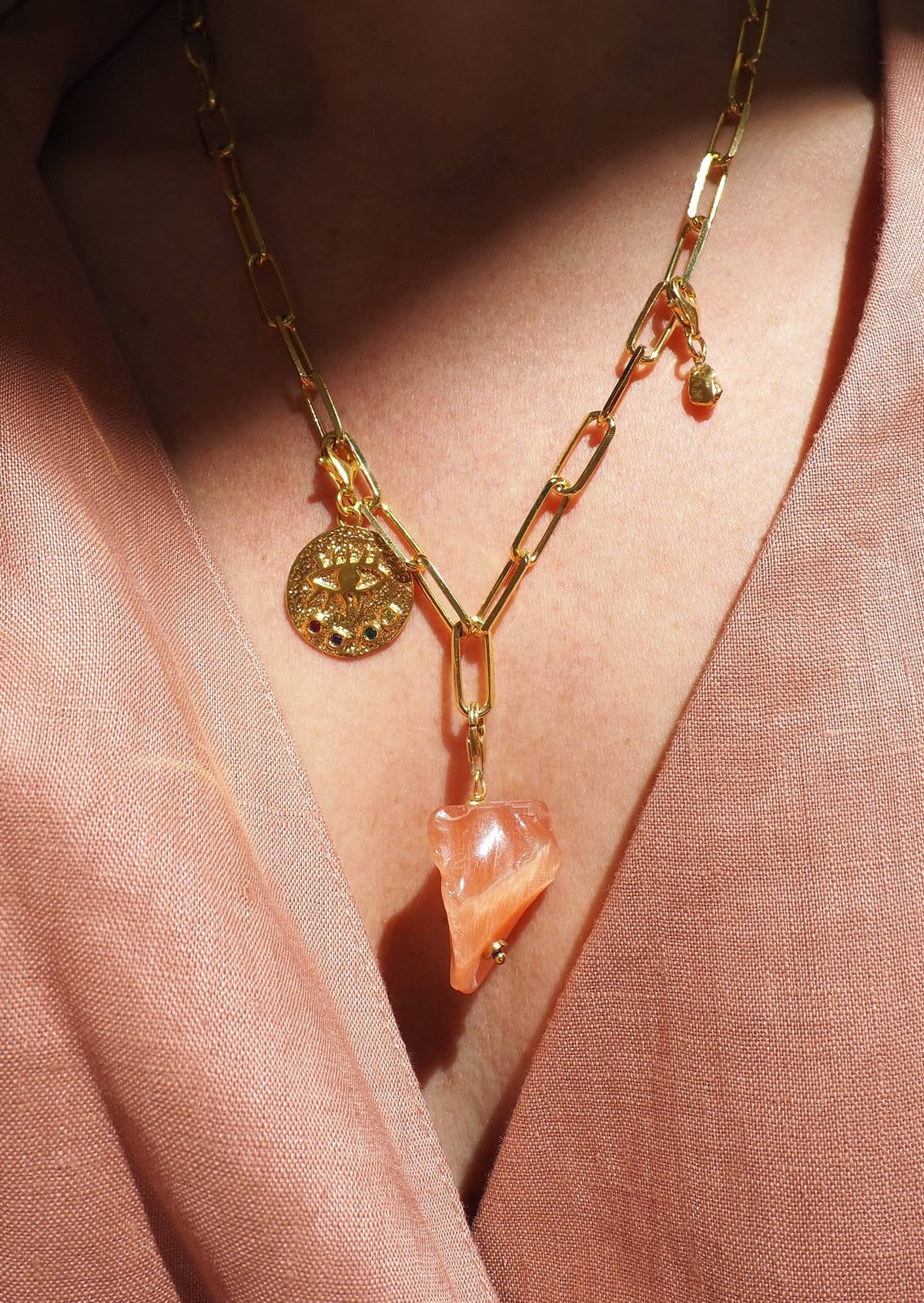 A chunky orange aventurine semi-precious stone known for its mood-lifting properties.